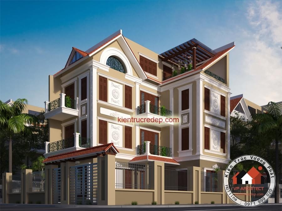 Kiến trúc mang phong cách cổ điển sang trọng, mặt tiền trang trí bằng hoa văn đắp nổi tinh tế,kết hợp với phào chỉ cuốn quanh tạo thành 1 tác phẩm kiến trúc tập trung nhiều vẻ đẹp tinh túy nhất.Phía cao nhất tầng 4 là Ban công rộng với giàn cây leo tạo khoảng xanh mát,nổi nên trên nền kiến trúc cổ kính. Phía trước là Phòng thờ - Linh thiêng trang trí bằng vòm kính cong kết hợp các họa tiết trang trí rất tỷ mỉ tạo lên 1 điểm tựa tâm linh mang đến tài lộc cho Gia chủ.