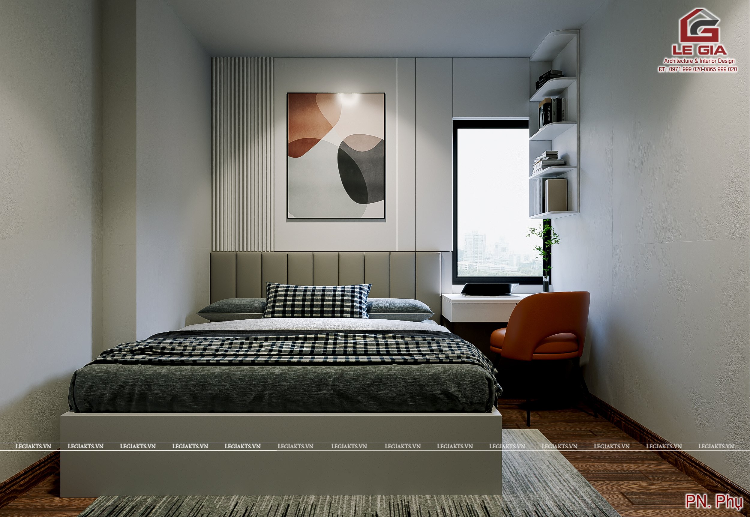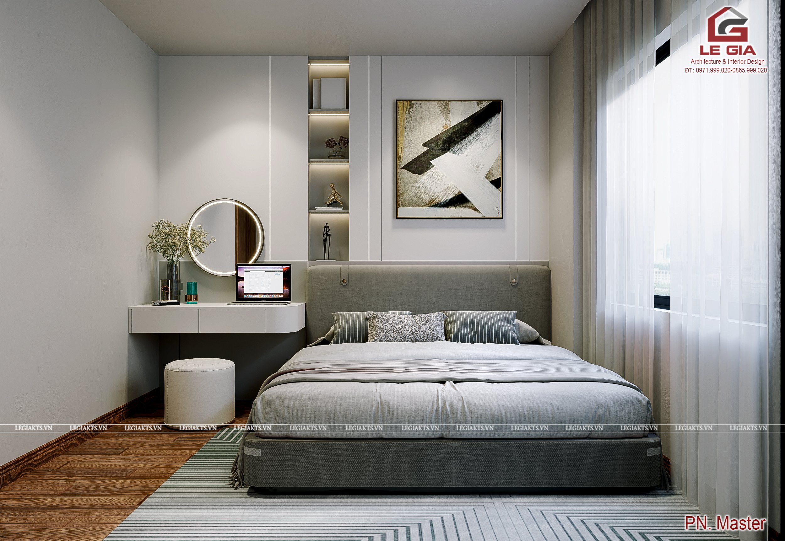 Phòng ngủ Master: gồm giường bọc da, bàn phấn, vách gỗ sau giường kết hợp ô để sách