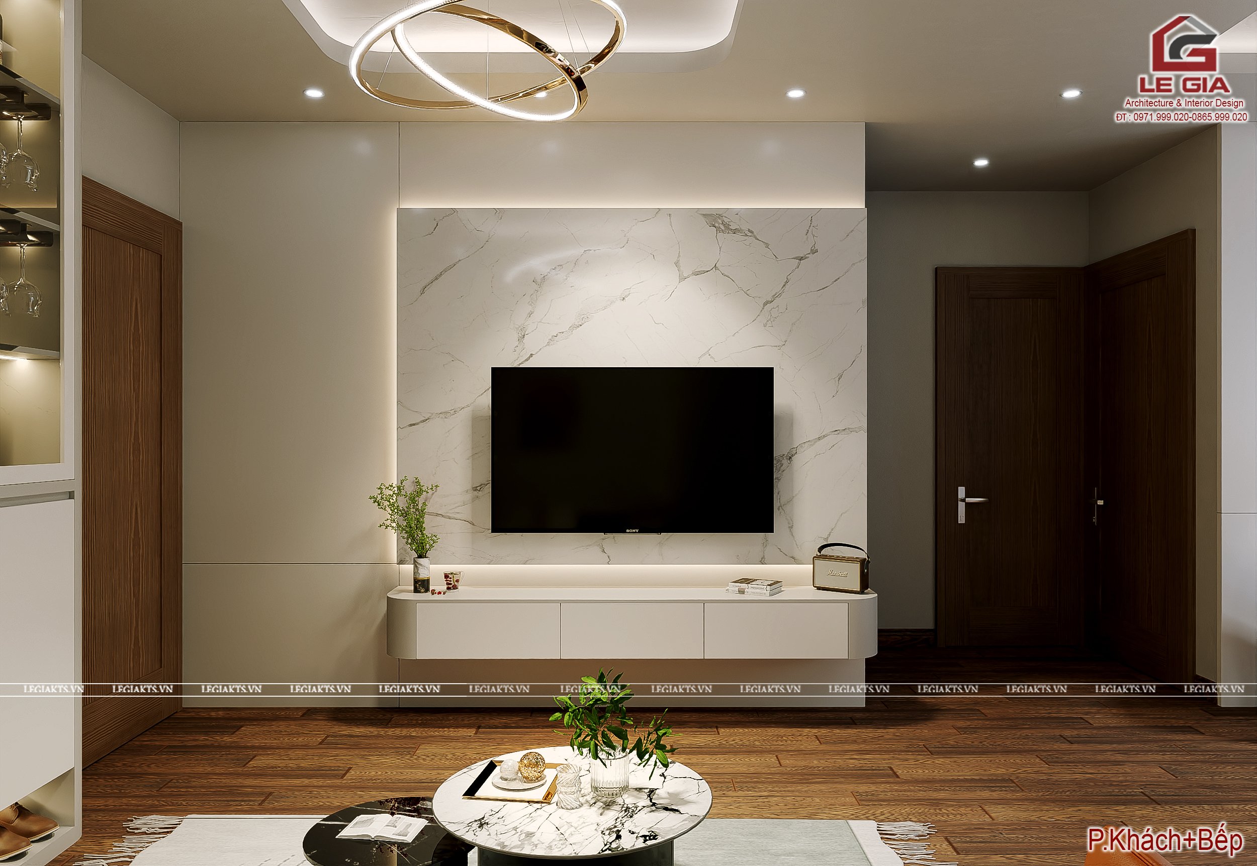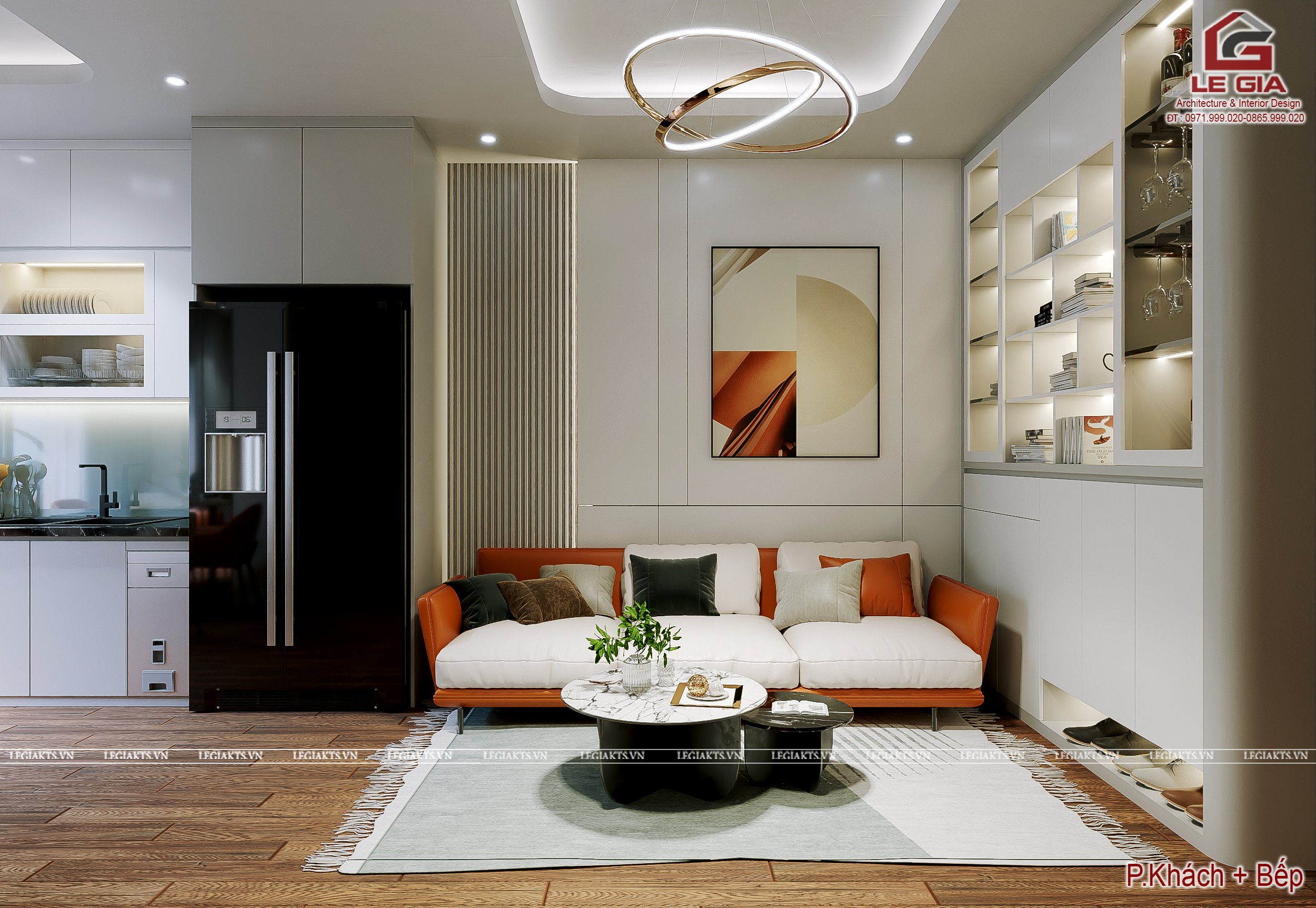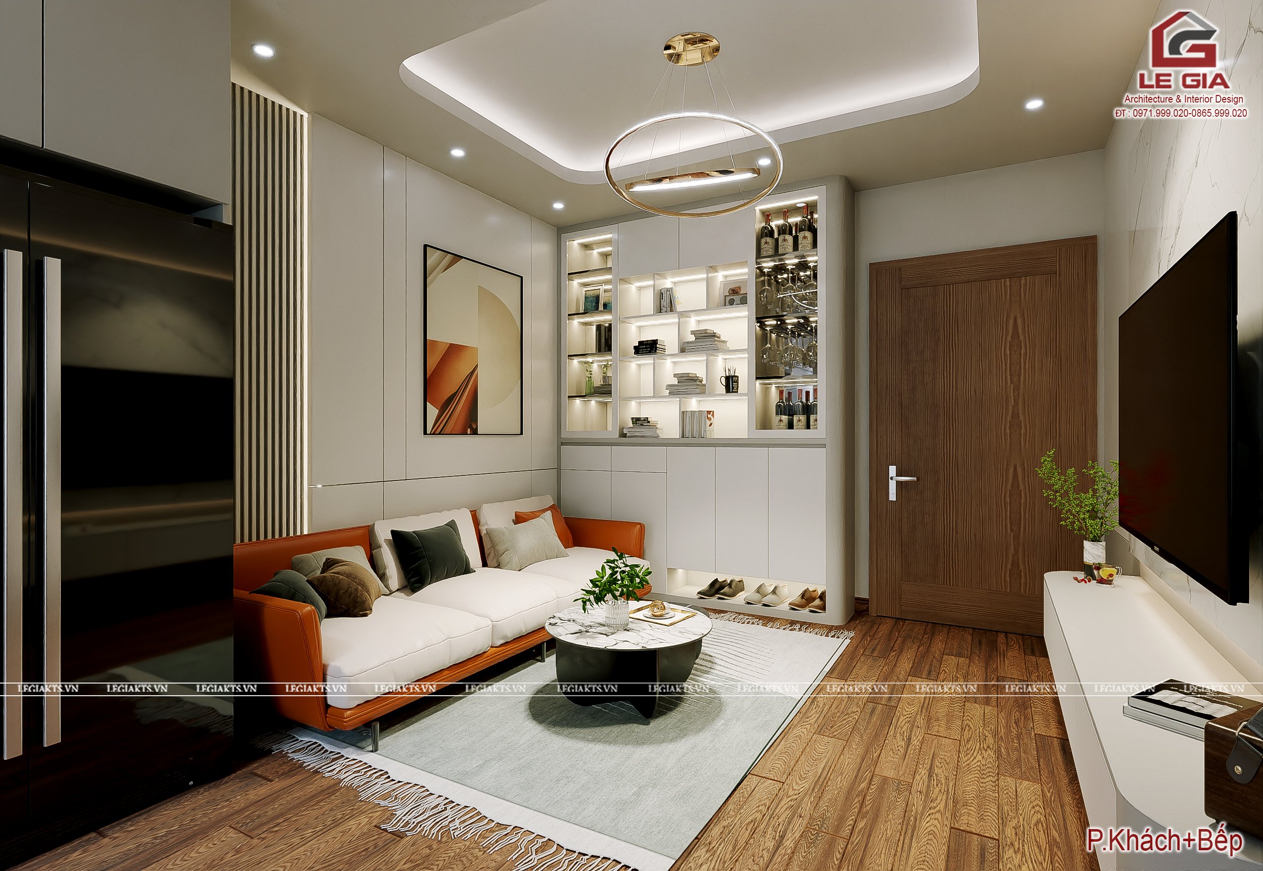 Phòng khách bao gồm sofa, bàn trà, kệ tivi treo, tủ rượu kết hợp tủ trang trí và để giày.
