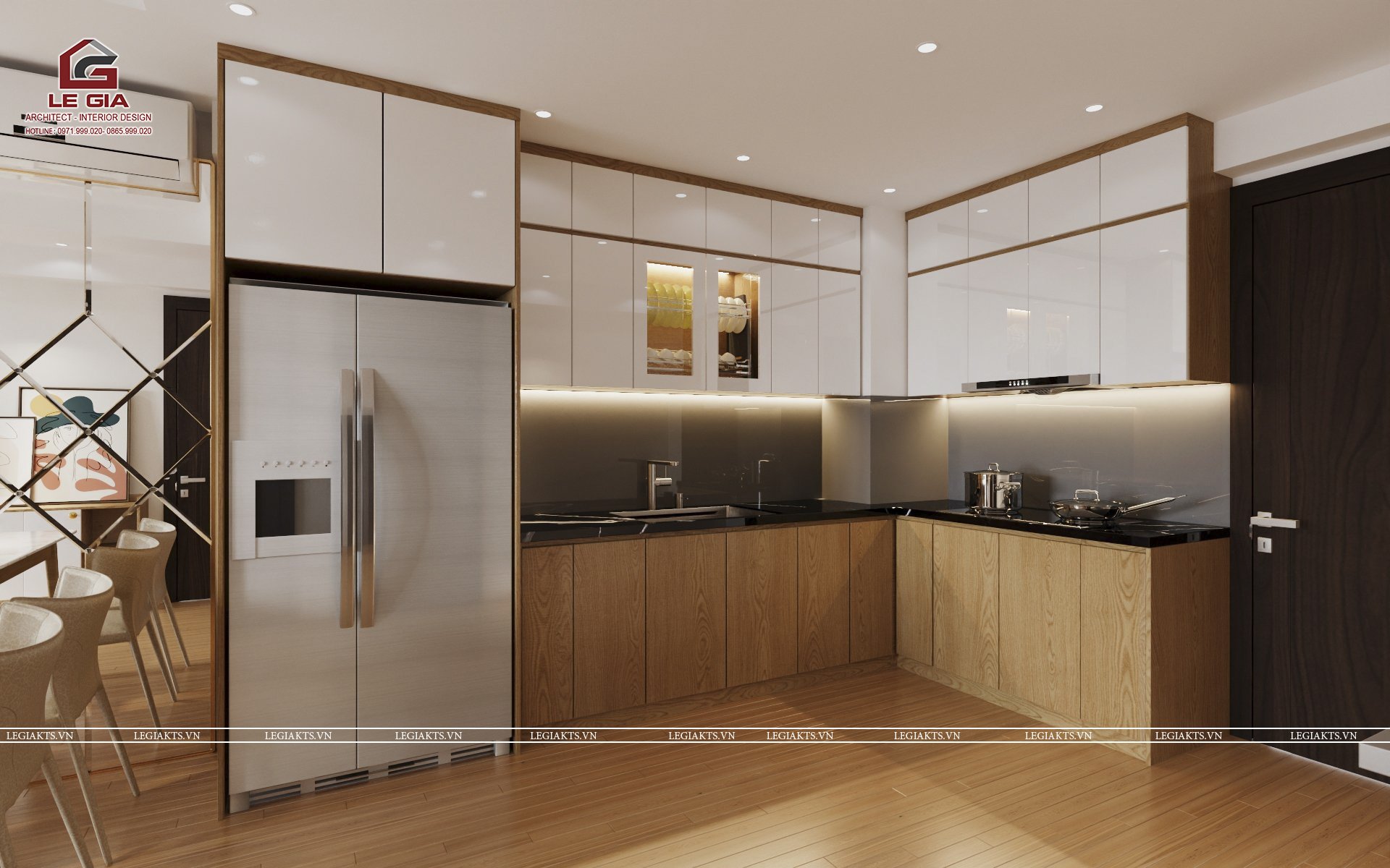 + phòng bếp dùng vách gương bỉ ghép quả chám tạo cảm giác không gian mở rộng