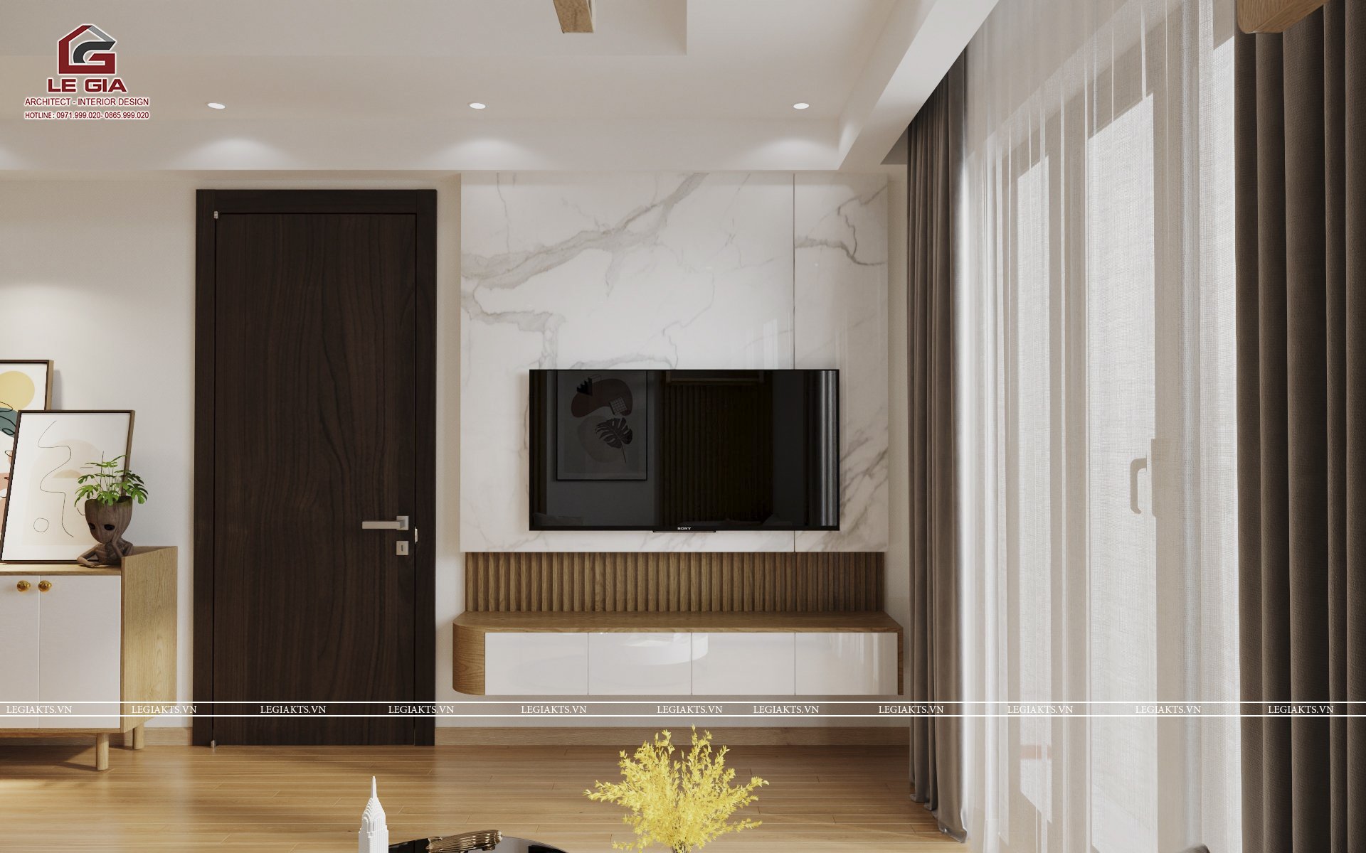 Kệ tivi treo dễ dàng vệ sinh và kết hợp vách PVC giả đá trang nhã