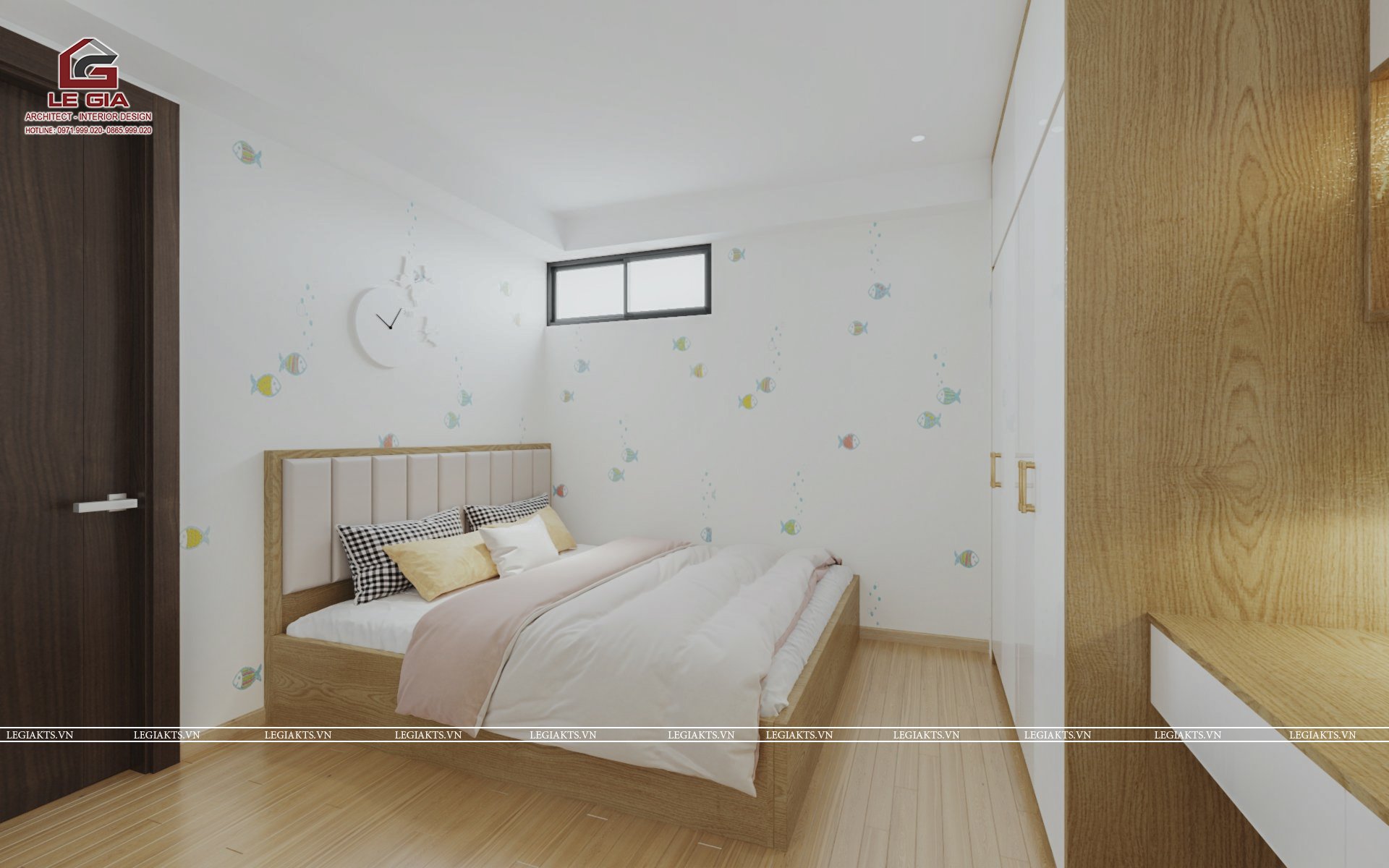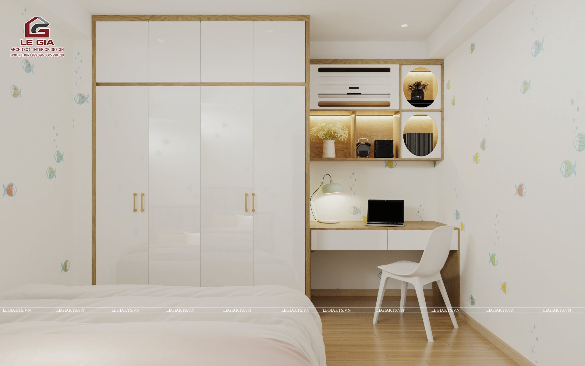 + Phòng ngủ bé gồm giường bàn học và giá sách