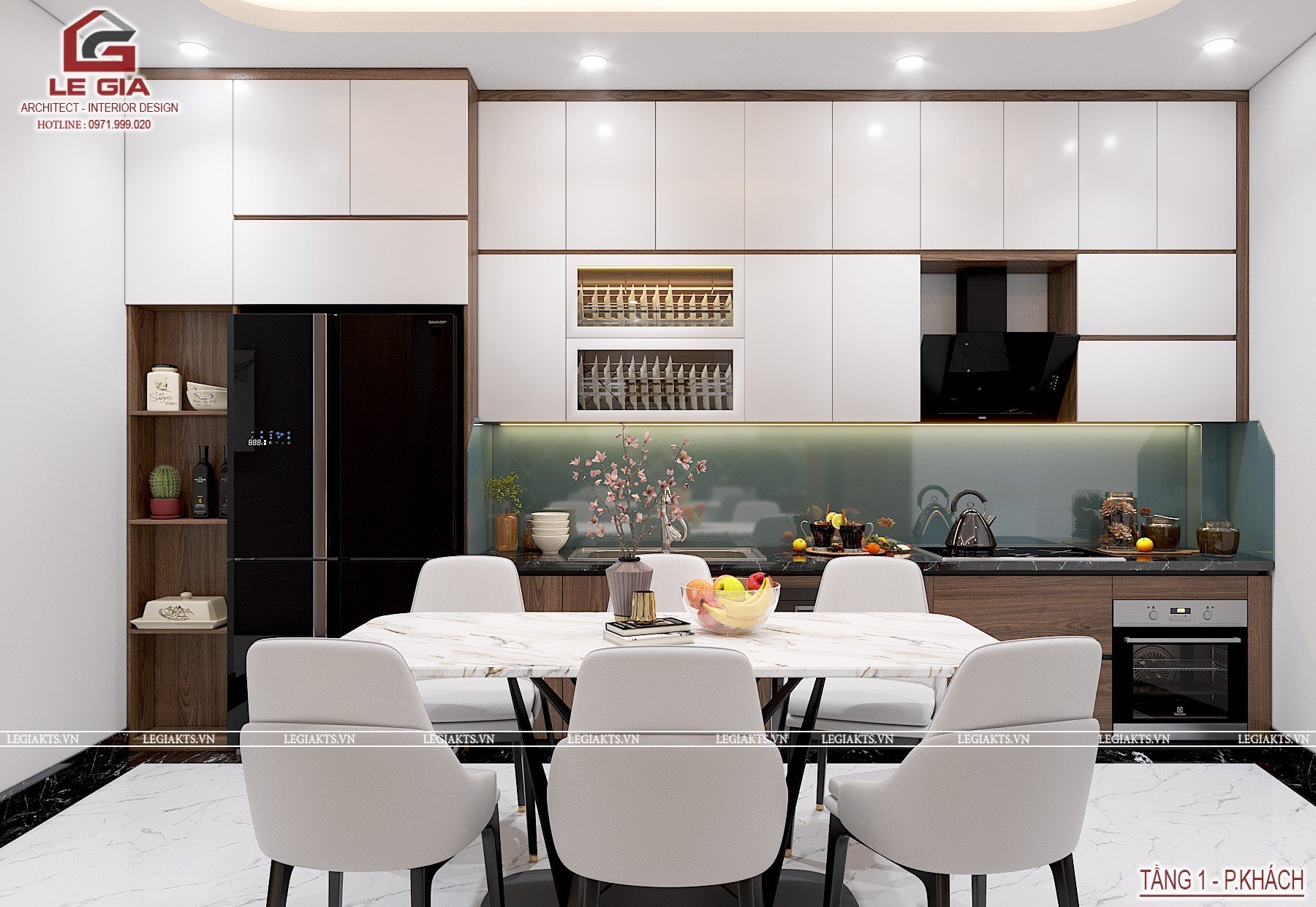 Tủ bếp kịch trần kết hợp tủ lạnh và tủ trang trí. Tủ bếp gồm 01 giá bát nâng hạ 2 tầng inox 304, cánh đẩy sử dụng tay nâng blum, 02 giá xoong nồi inox 304, 01 giá dao thớt inox 304, 01 thùng gạo mặt gương hàng hãng Eurogold. Kính ốp bếp giúp dễ dàng trong việc vệ sinh khi nấu ăn bám dầu mỡ, đá đen tia chớp cao cấp. Bàn ăn 6 ghế nhập khẩu, ghế chân thép sơn đen mặt bọc da, bàn ăn chân thép sơn đen mặt đá ceramic trắng.