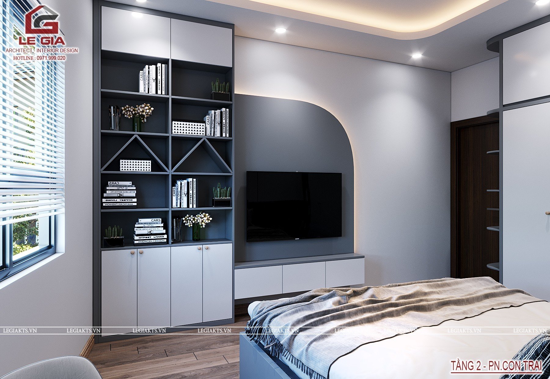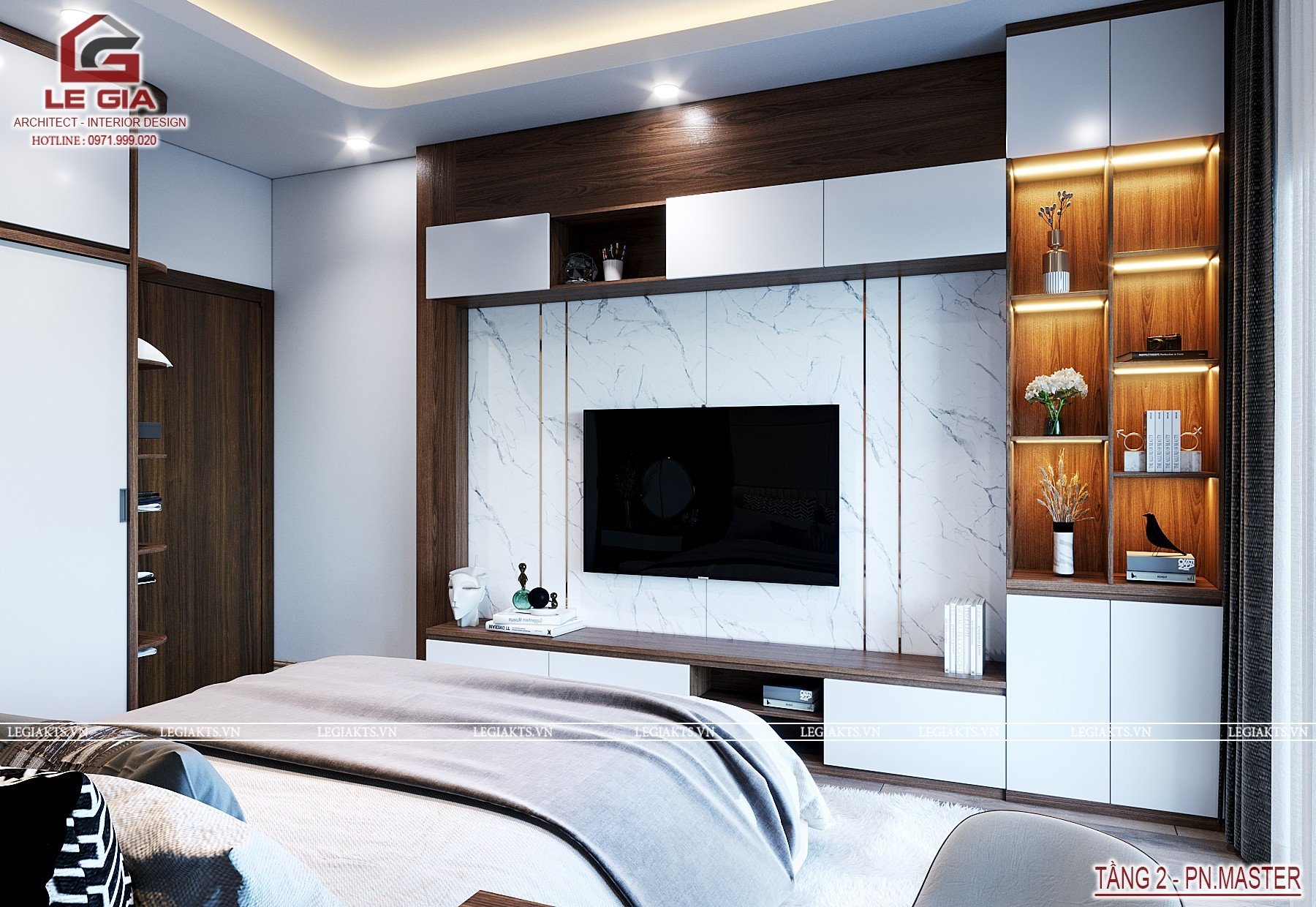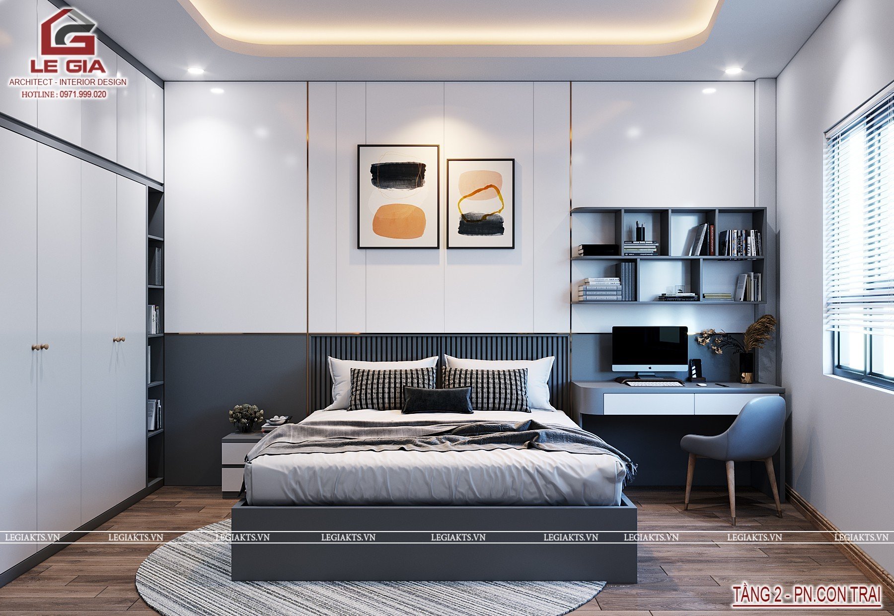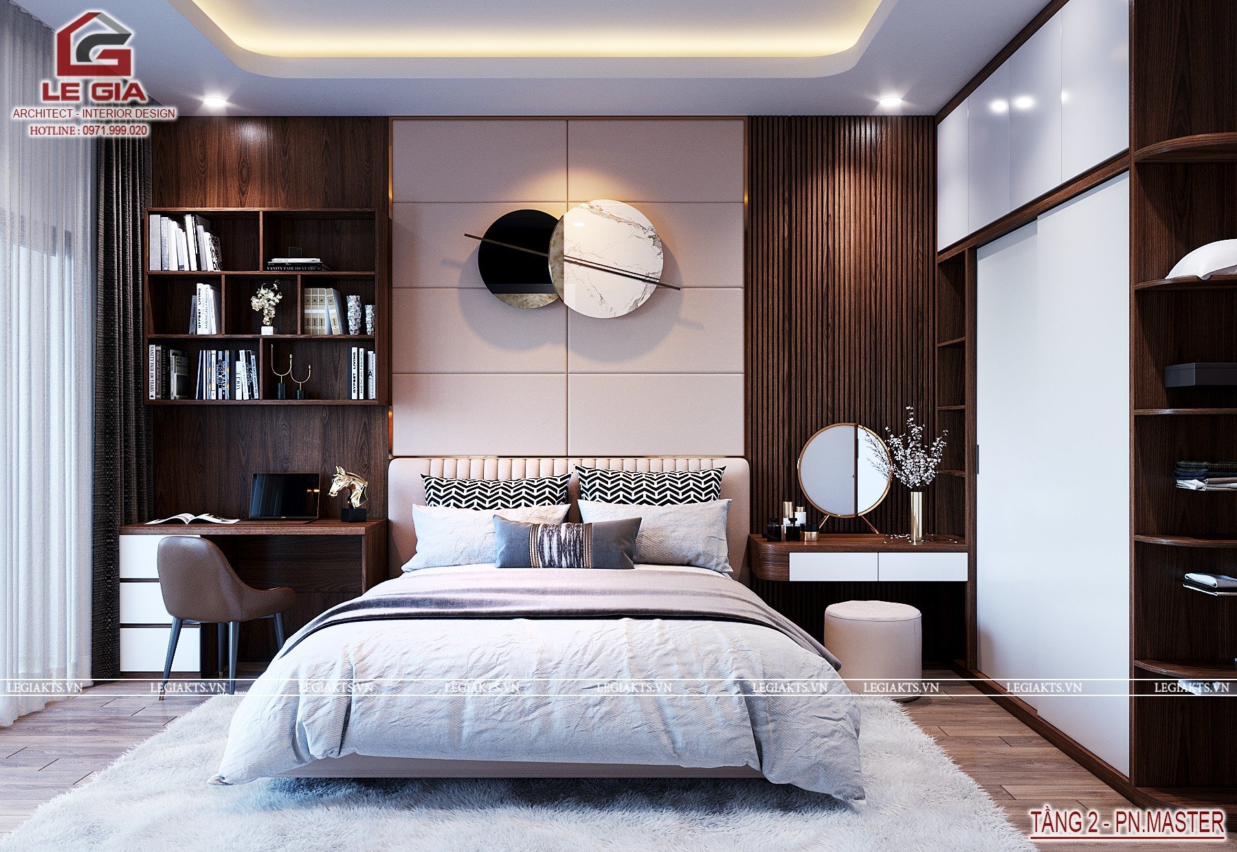 Phòng ngủ master: gường 1.8*2m bọc da, bàn làm việc và bàn học. Sau giường vách da nhân tạo chống phồng rộp kết hợp nan sóng tạo điểm nhấn.