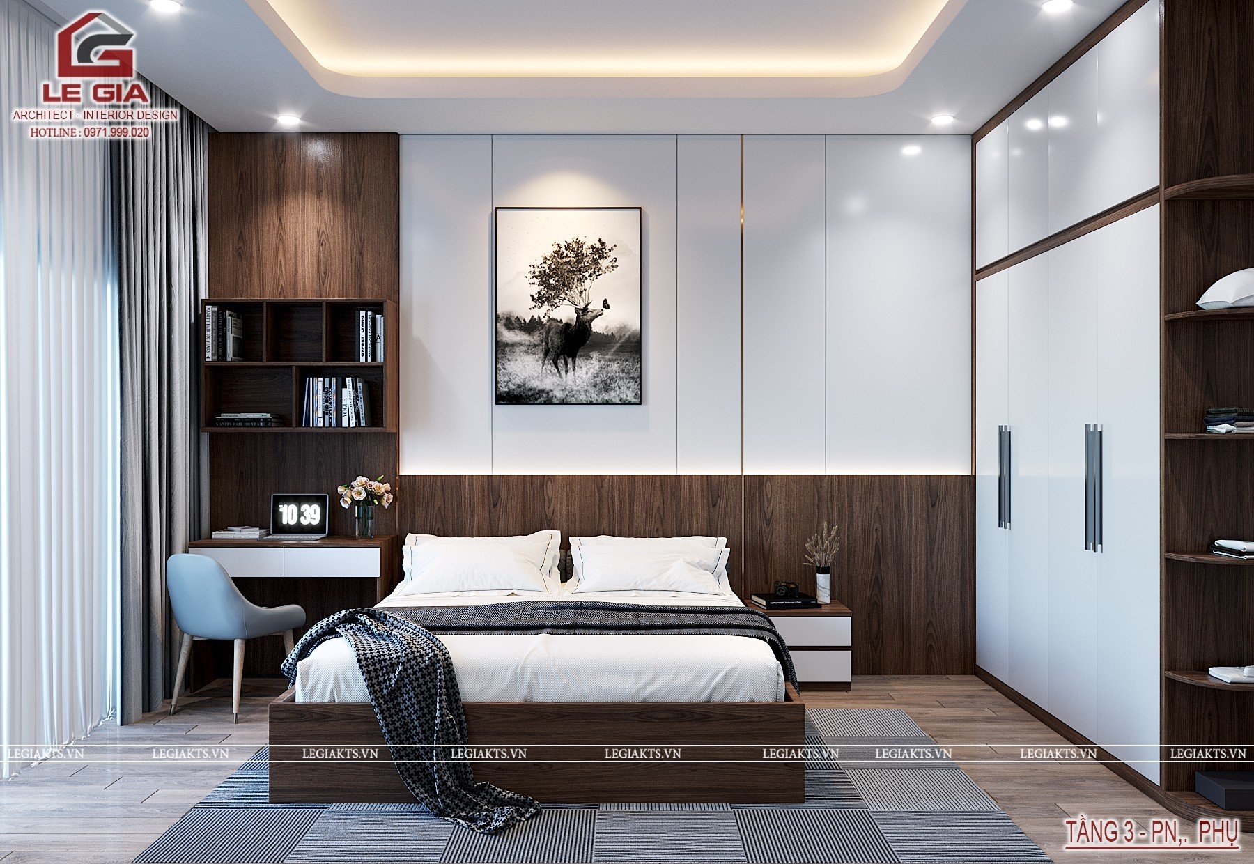 Phòng ngủ ông bà với tông màu trắng đối lập với gam màu gỗ đậm, họa tiết trơn đối lập với vân gỗ. Phòng ngủ ông bà cách thiết kế thiên về sự đơn giản, ngăn nắp và tiện nghi để đảm bảo căn phòng luôn thông thoáng