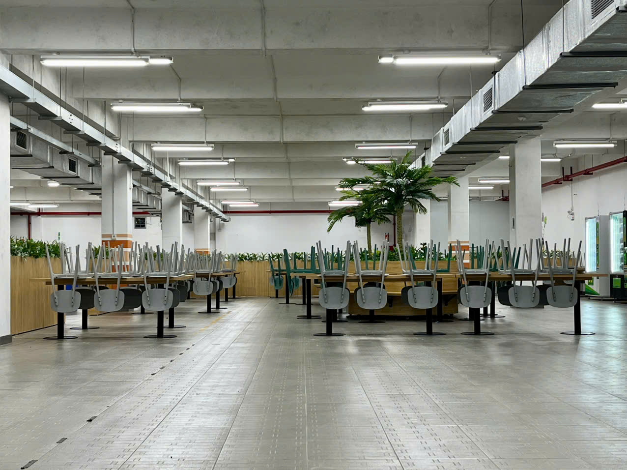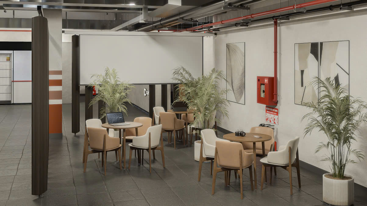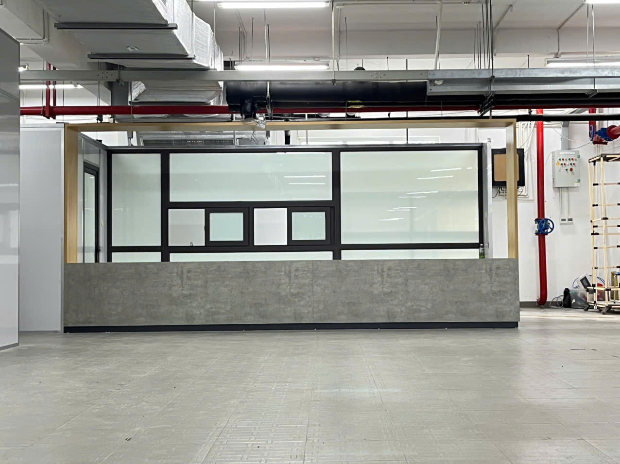 Khu vực phòng ngồi cho lãnh đạo có máy chiếu được kết hợp như một phòng họp đảm bảo tính riêng tư, cây xanh tạo cảm giác thư thái