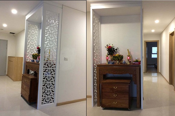Bàn thờ chung cư thờ gia tiên hay bàn thờ Phật phải được đóng bằng gỗ mới, không được tận dụng dùng gỗ đã cũ, đã qua sử dụng. Chọn vị trí đặt bàn thờ chung cư trước khi đặt đóng bàn thờ để có thể căn đo kích thước, lên mẫu thiết kế và sơn phủ thếp phù hợp. Sau đây Kientrucvuongphat.Vn xin chia sẻ đôi điều về phong thủy đặt bàn thờ: