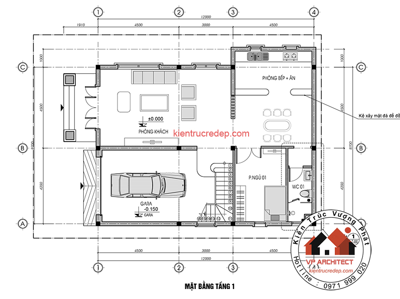 Mặt bằng tầng 1: Với không gian rộng nối niền phòng bếp và phòng khách