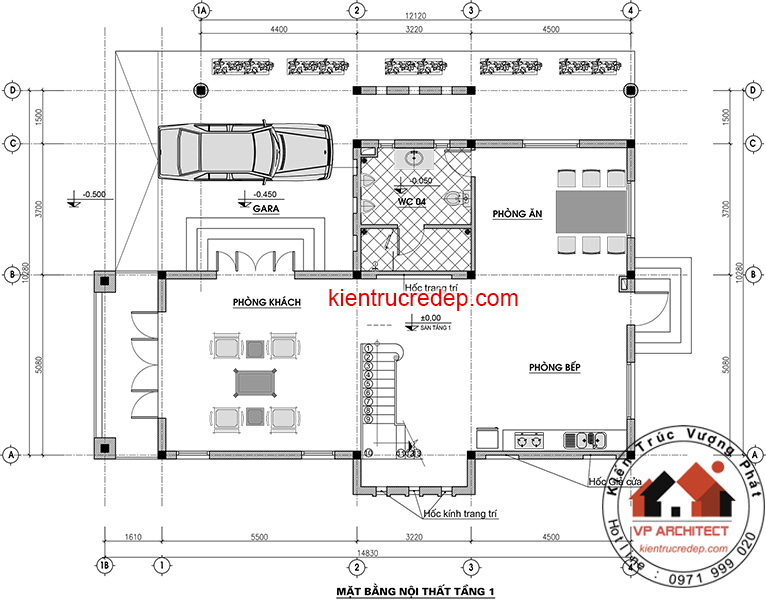 Mặt bằng tầng 1: Các phòng rộng, thoáng Gia chủ có thể đón được nhiều khách đến thăm quan mỗi khi có công việc
