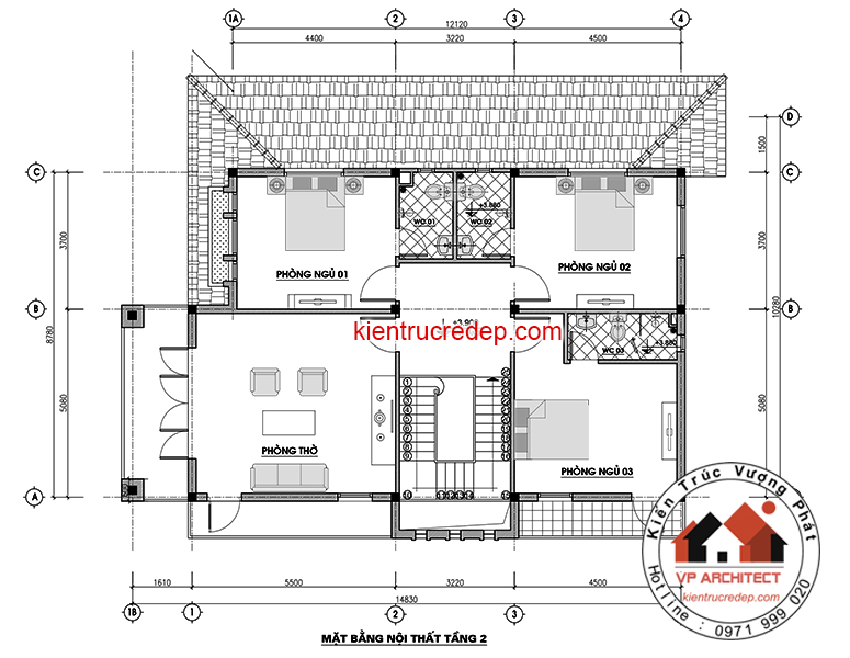 Tầng 2 : 1 Phòng thờ + 3 phòng ngủ + 2 WC