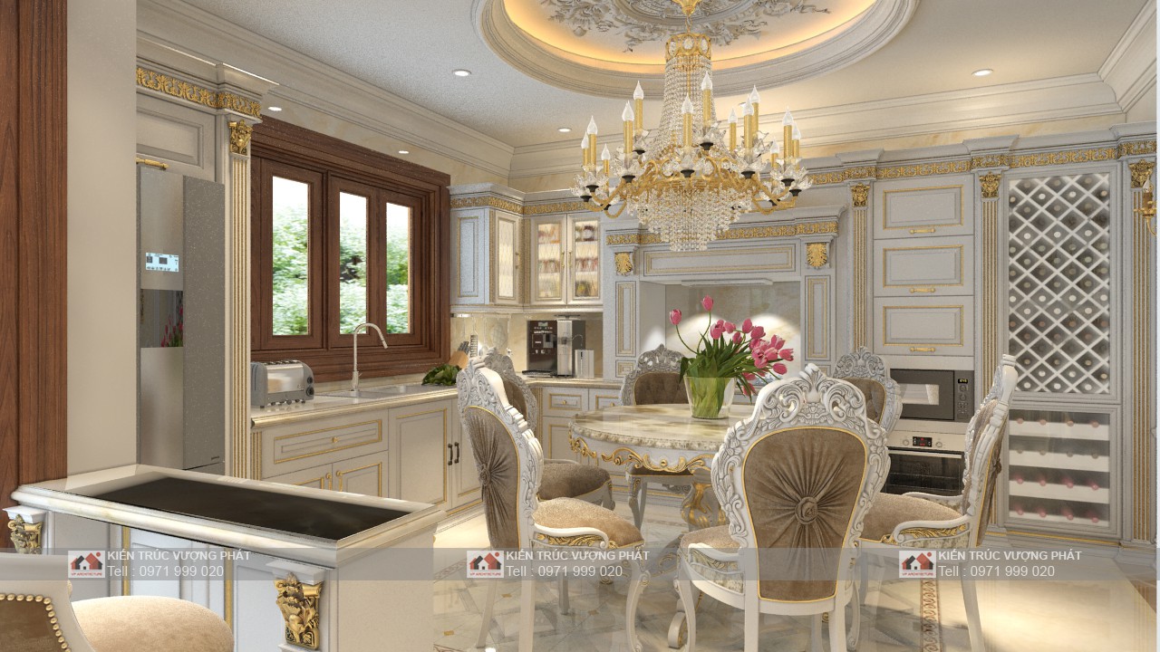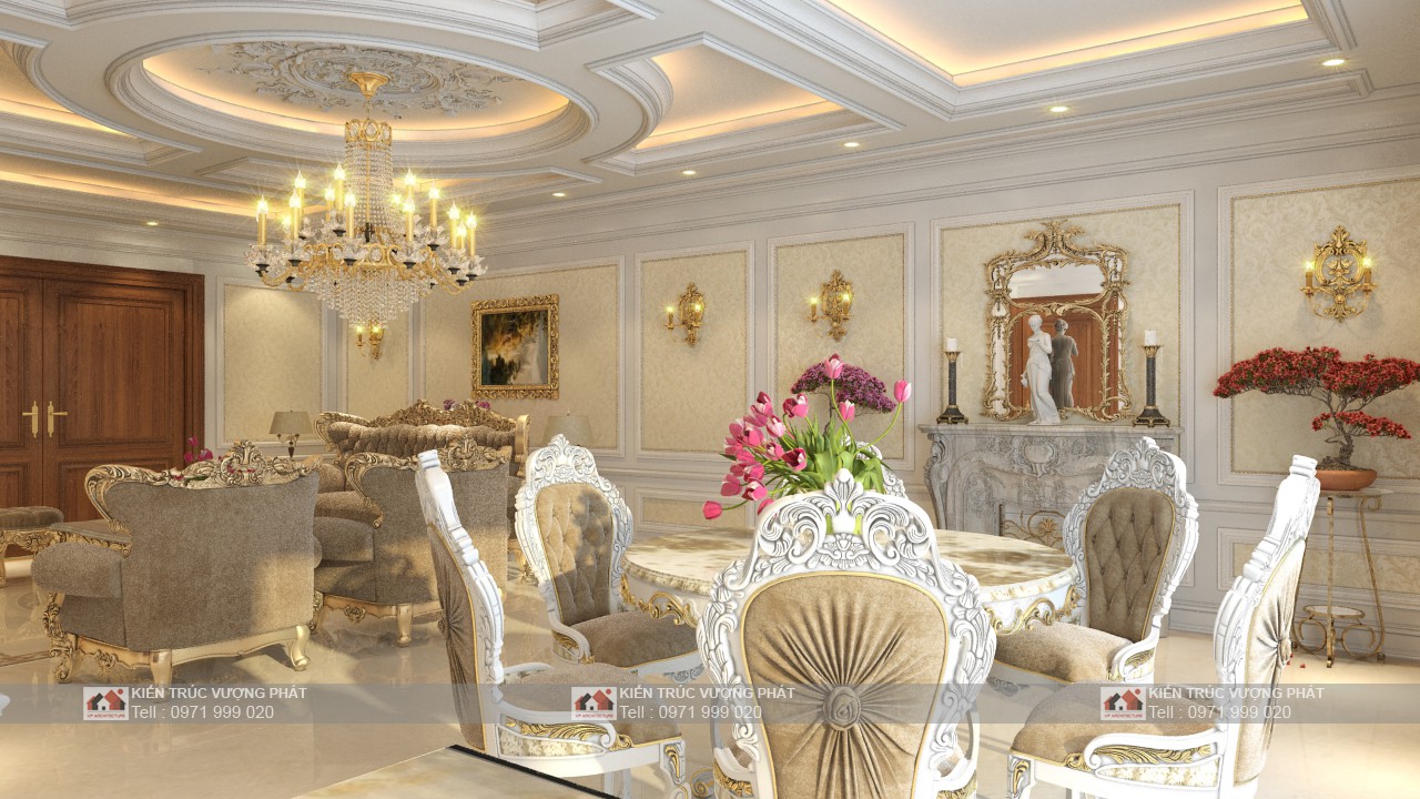 Nội thất bàn ghế được thiết kế với hình dáng cổ điển, hoa văn giác vàng kết hợp với tông màu vàng nhẹ theo phong cách cổ điển hoàng gia làm nên vẻ đẹp hoành tráng của nội thất bên trong biệt thự,