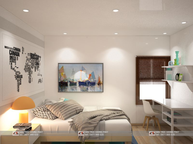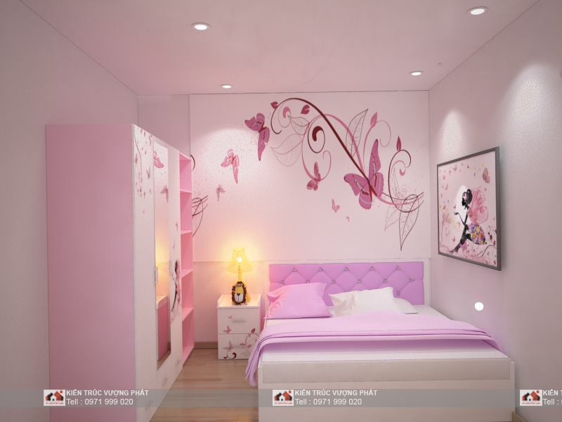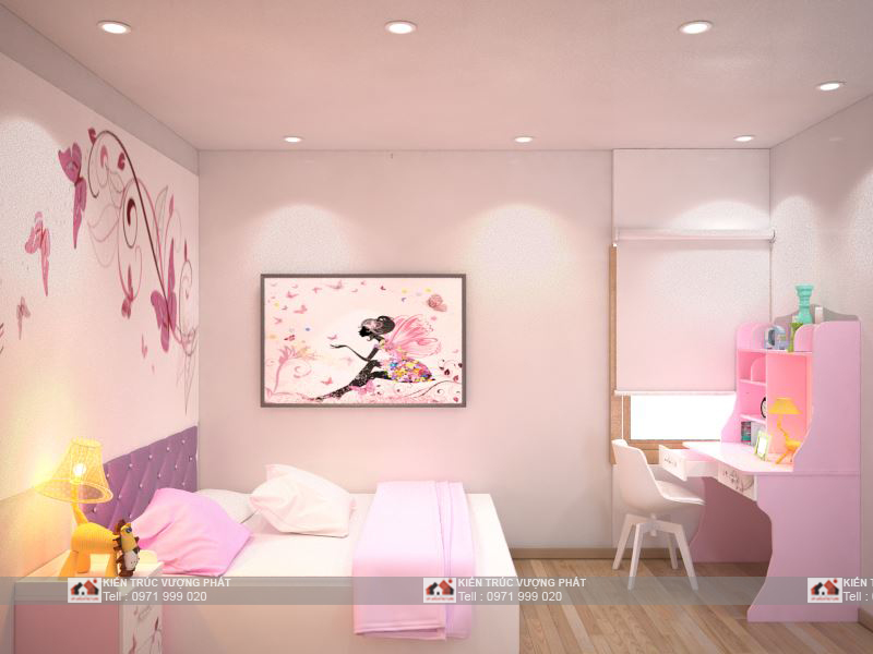 Phối cảnh phòng ngủ con gái: Phòng con gái được thiết kế theo tông màu nhẹ nhàng, phù hợp với tính cánh nữ tính con gái