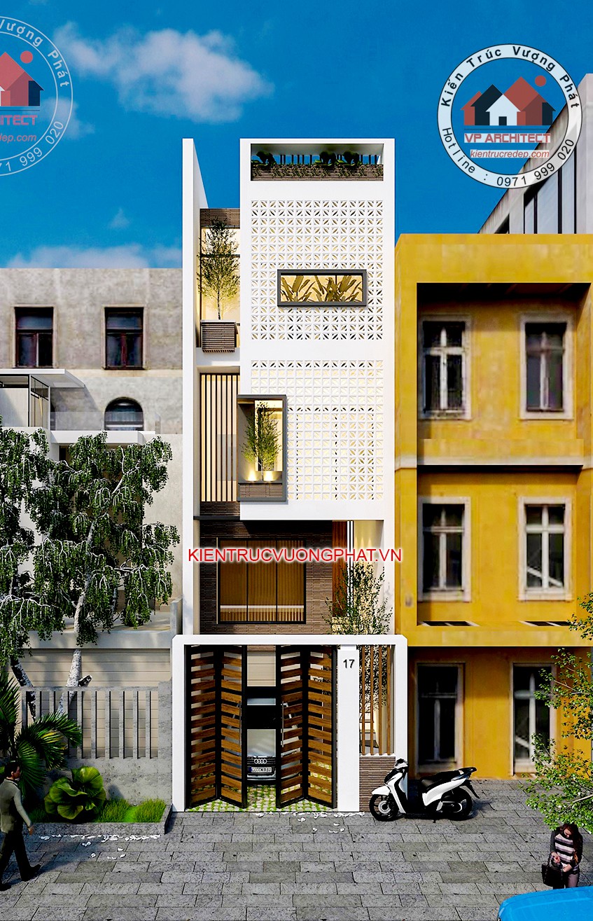 Phối cảnh mặt tiền độc đáo với giải pháp cây xanh và gạch thông gió tạo lên nét đặc biệt của ngôi nhà.