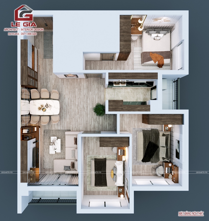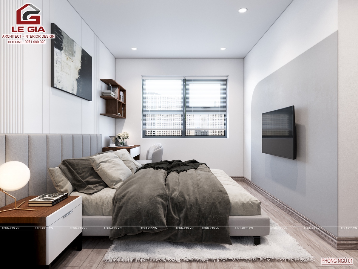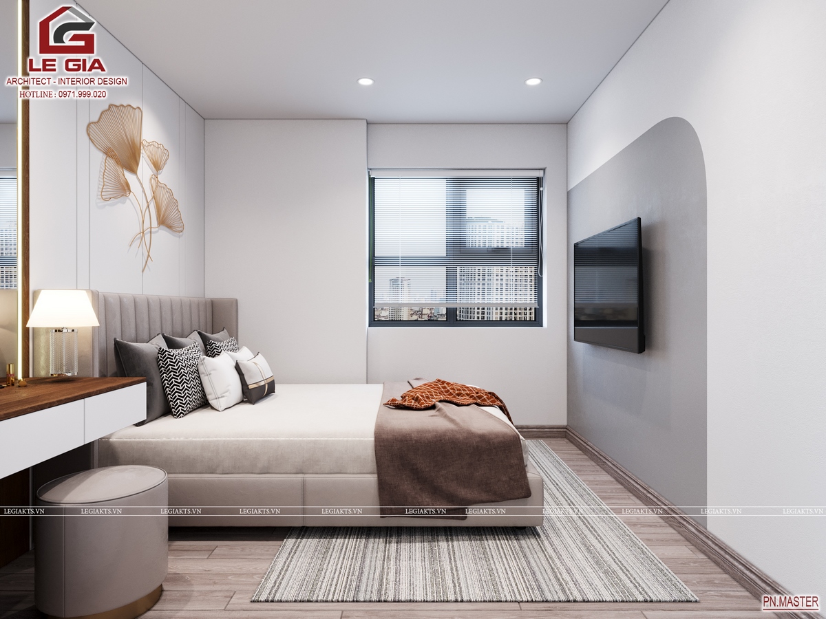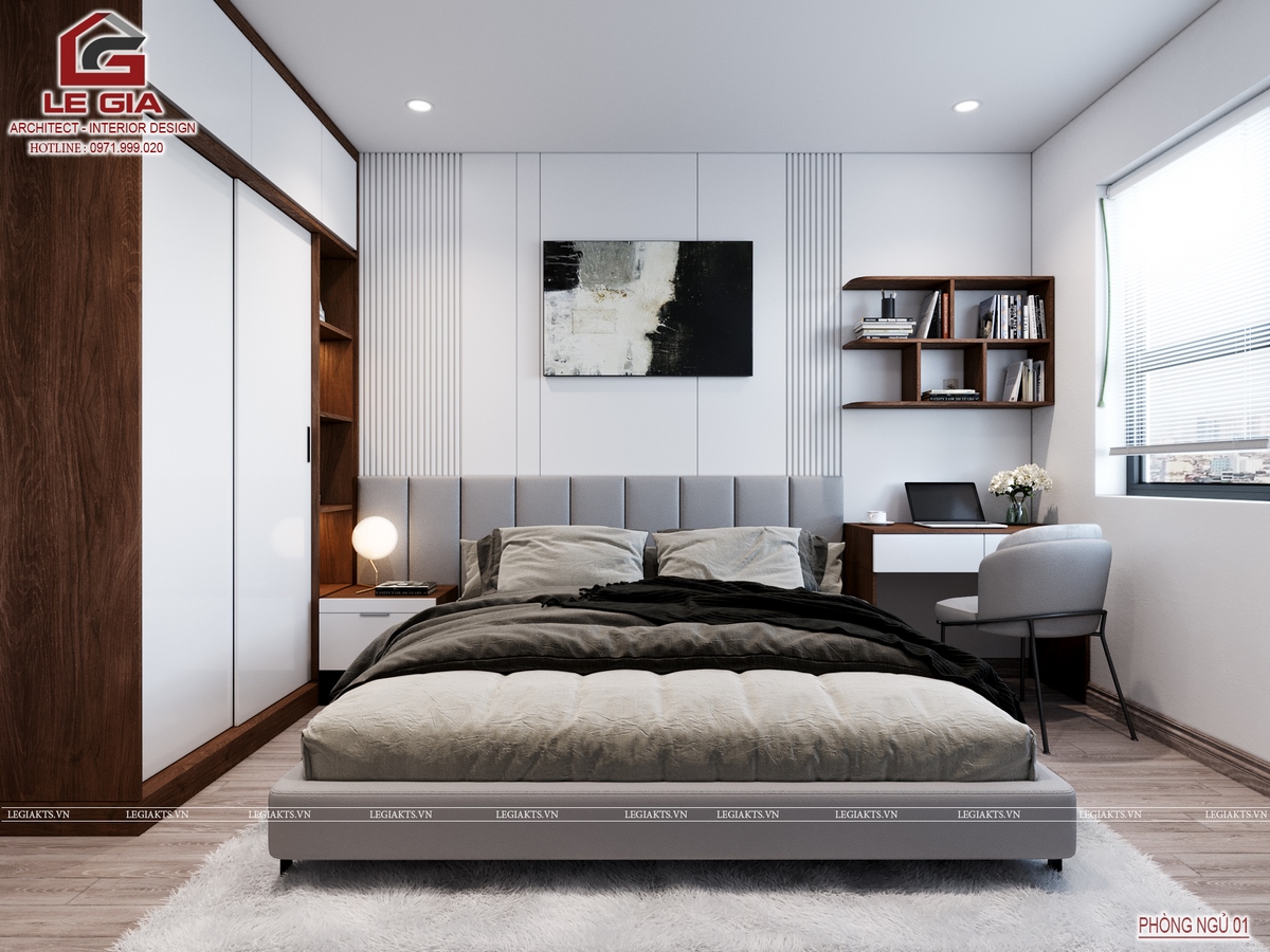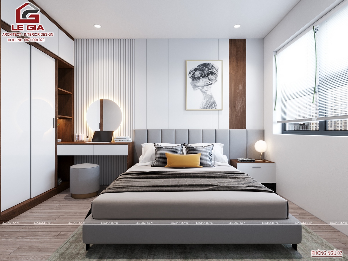 Với tông màu chủ đạo là những trung tính nhẹ nhàng KTS của Lê Gia đã phối màu trung tính với các gam màu vân gỗ sẽ tạo nên không gian hiện đại, không kém phần sang trọng. Đặc biệt với xu hướng thiết kế thi công nội thất hiện nay thì phong cách hiện đại với gam màu trung tính đang ngày càng phổ biến.