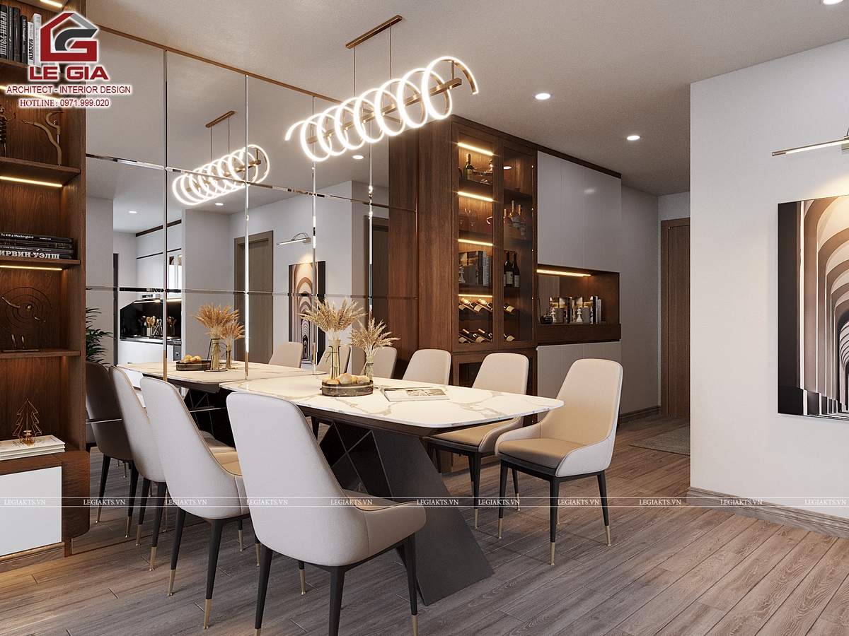 Bước vào căn hộ chúng ta sẽ thấy phòng khách kết hợp cùng phòng ăn. Lê Gia đã kết hợp với vách gương trang trí đánh lừa thị giác người nhìn tạo cảm giác rộng hơn cho căn hộ