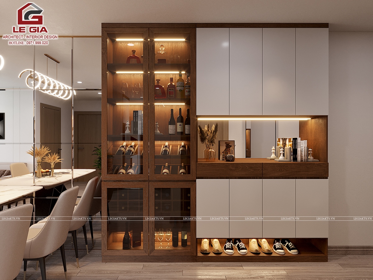 Tủ rượu kết hợp với tủ giày thiết kế theo phong cách hiện đại được làm từ chất liệu MDF cốt xanh chống ẩm phủ Melamine rất phù hợp với những căn hộ chung cư có cửa ra vào gần phòng khách