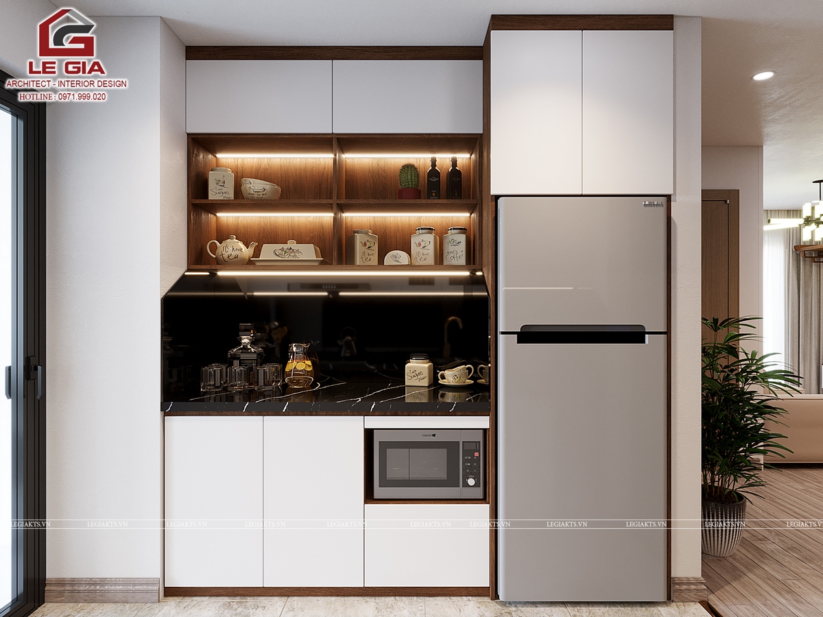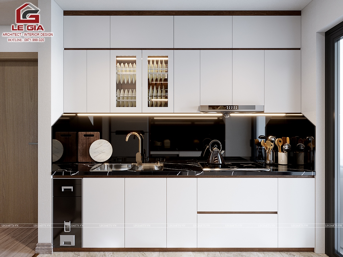 Tủ bếp với gam màu trắng chủ đạo kết hợp với mặt đá và kính màu đen sự kết hợp này tạo nên sự tinh tế và sang trọng cho không gian. Bé nhưng vẫn đầy đủ tiện nghi