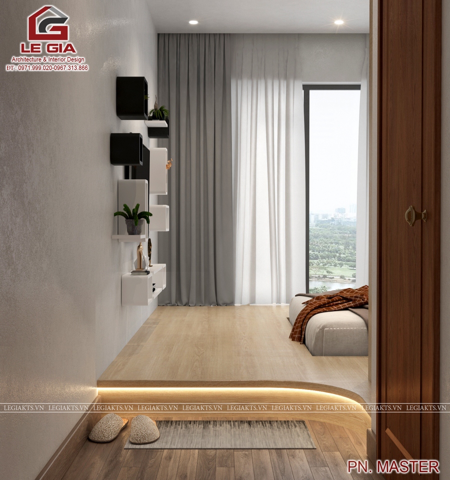 Một điều đặc biệt của căn hộ chính là thiết kế nội thất phòng ngủ master theo phong cách Hàn Quốc, vì gia chủ là 1 người nước ngoài muốn có một thiết kế phòng ngủ giống như ở nơi quê nhà của anh.Một phòng rộng với sạp gỗ tạo giường và tủ cánh trượt mang đậm phong cách của nội thất Hàn Quốc.Mời quý bạn xem phối cảnh như sau :