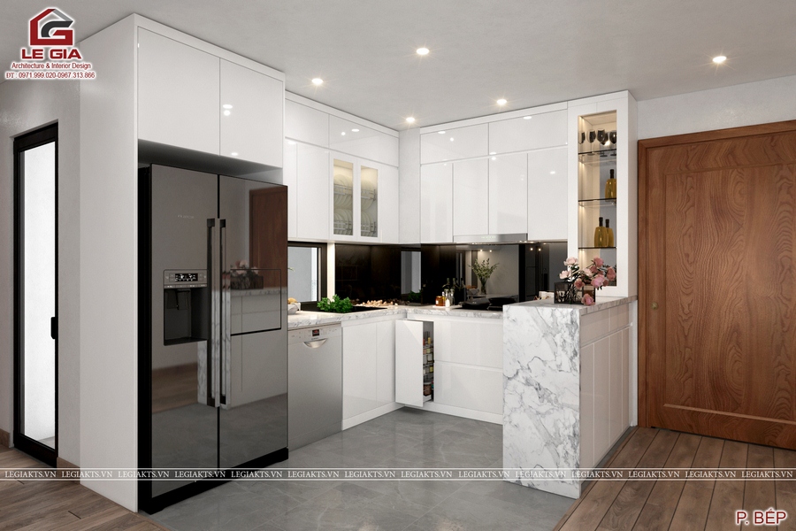 Mở đầu không gian căn hộ với sảnh vào rộng rãi, và khu bếp thoáng rộng, được chúng tôi bố trí rất nhiều tiện nghi với máy rửa bát, phụ kiện tủ bếp thông minh với giá bát di động, giá dao thớt, giá xoong nồi ...với quầy bar quay ra phía lối đi thật rộng rãi , bạn sẽ thấy 1 điều tuyệt vời về một không gian mở, thoáng của căn hộ ngay khi mới bước từ cửa vào.