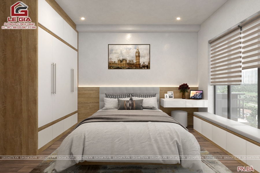 Sau cùng là thiết kế phòng ngủ người già với yêu cầu tông màu trầm nhẹ nhàng, mọi thứ phải dễ dàng sử dụng. Lê Gia Design đã nắm bắt được tâm lý của gia chủ và đưa ra một thiết kế phù hợp như sau :