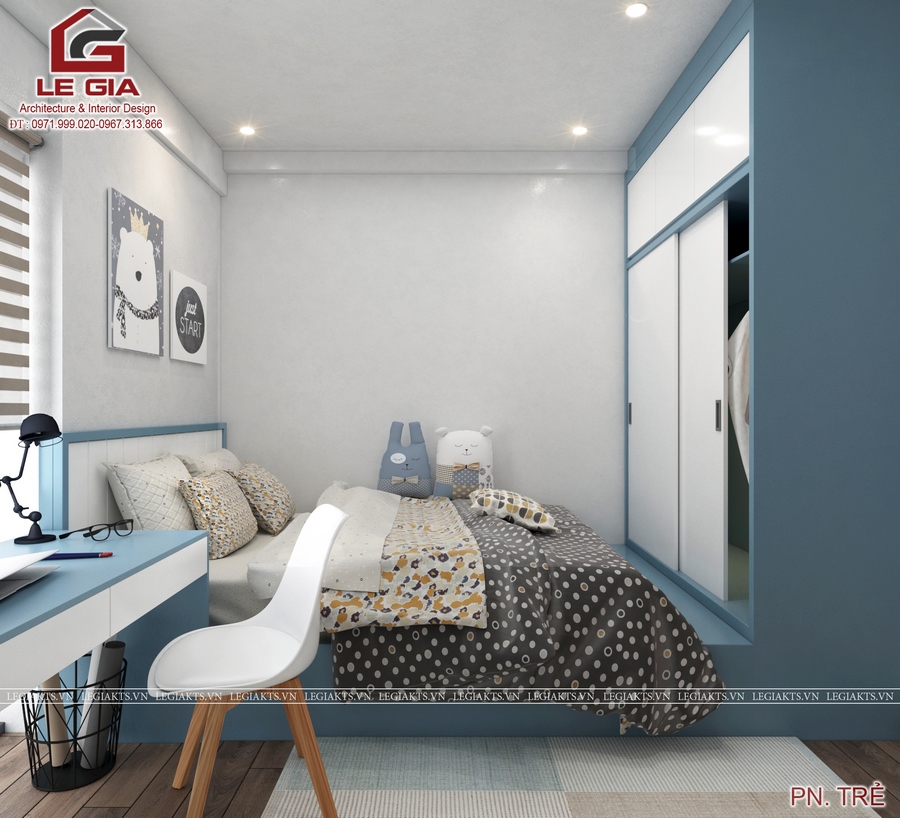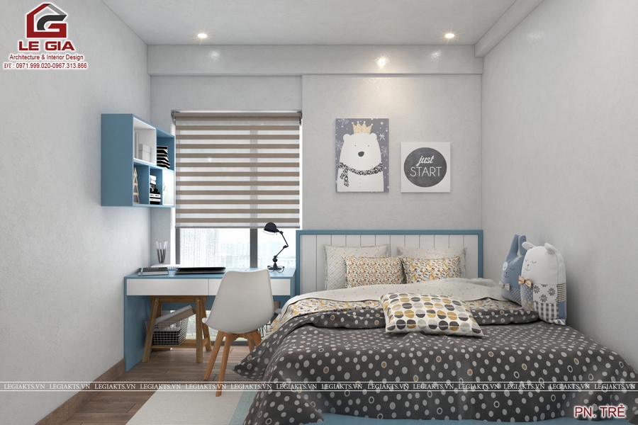 Tiếp đến là thiết kế nội thất phòng ngủ bé trai đẹp và cá tính với gam màu xanh nam tính và không gian học tập đầy ánh sáng tự nhiên !
