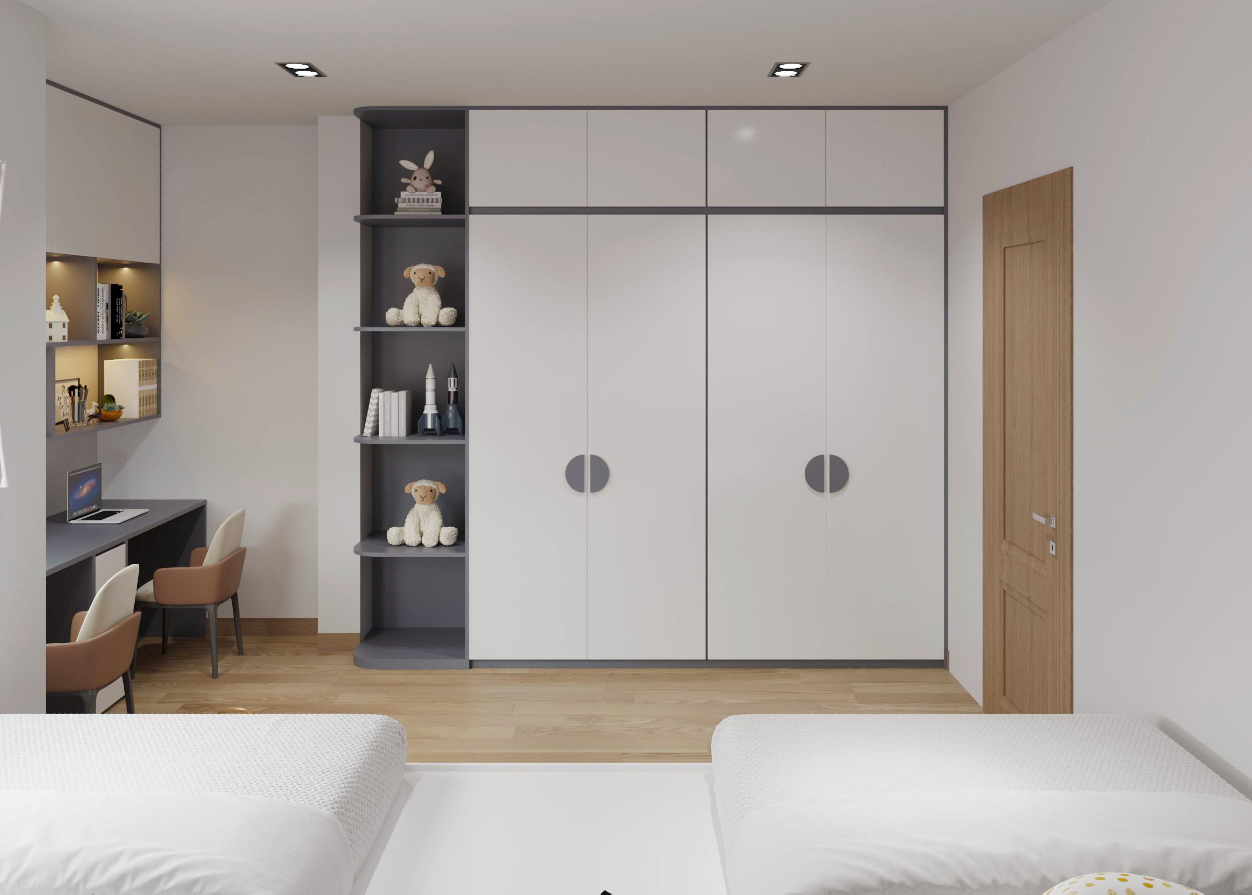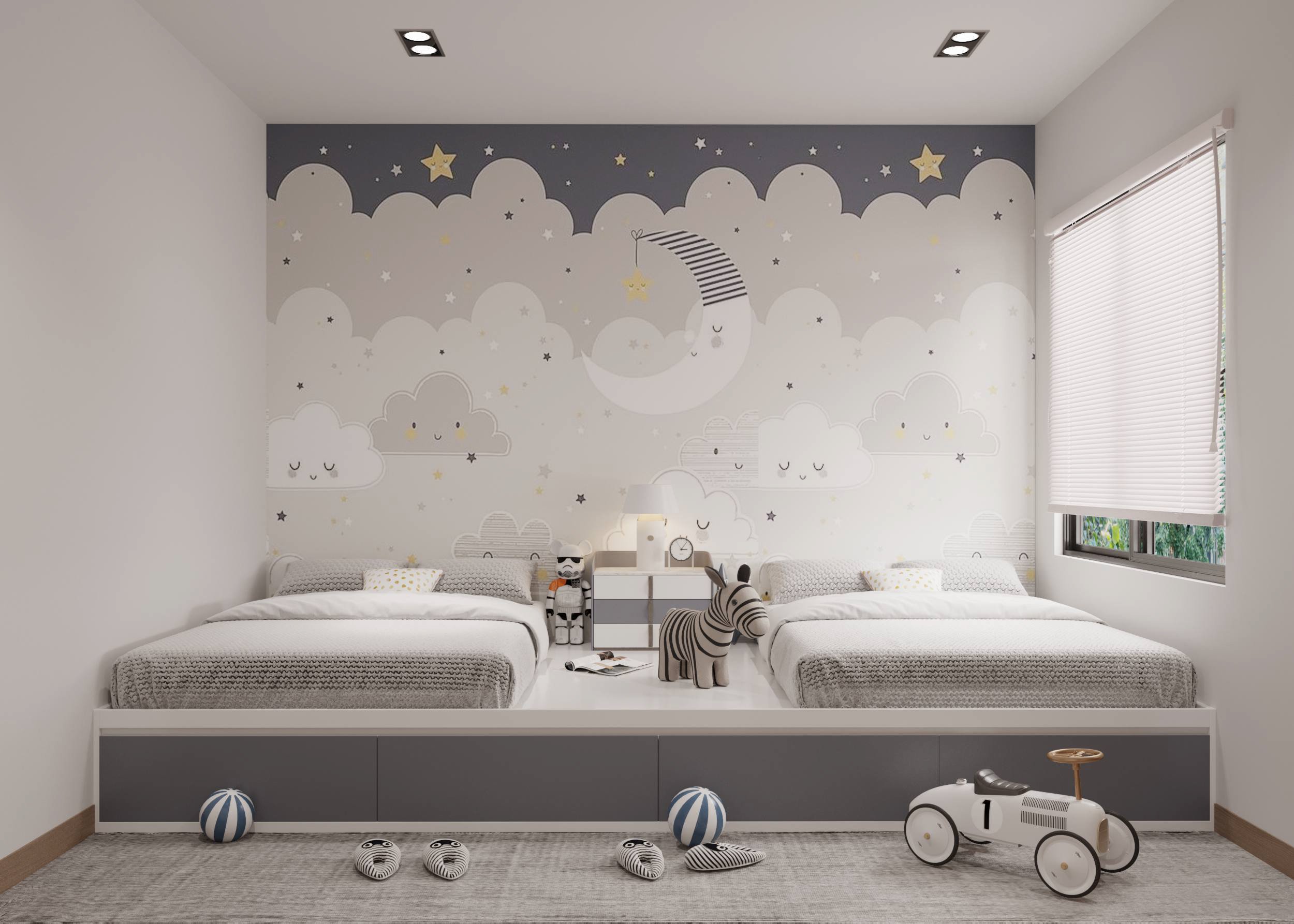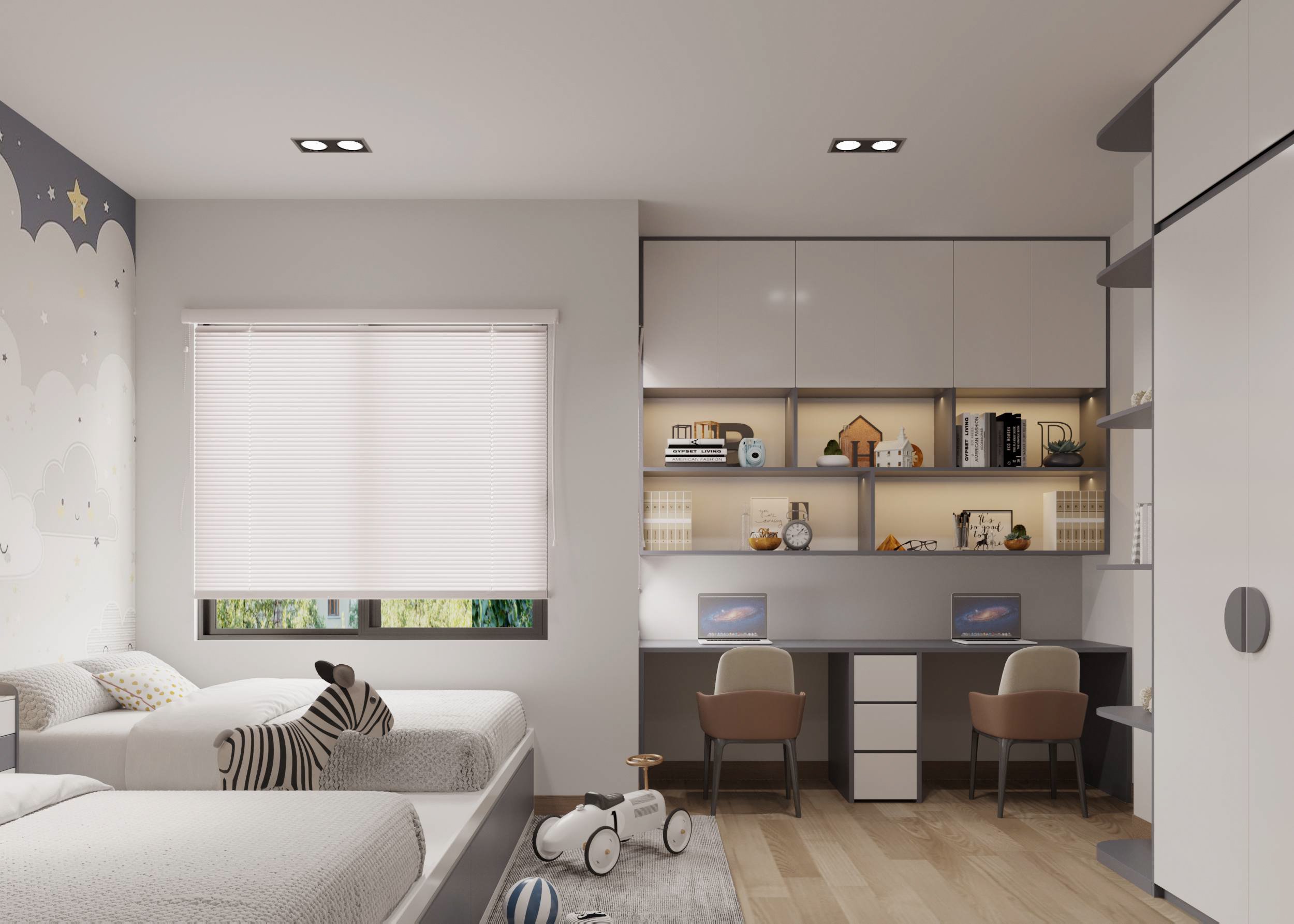 Phòng ngủ 2 bé trai sử dụng tông màu ghi xám và màu trắng làm chủ đạo.