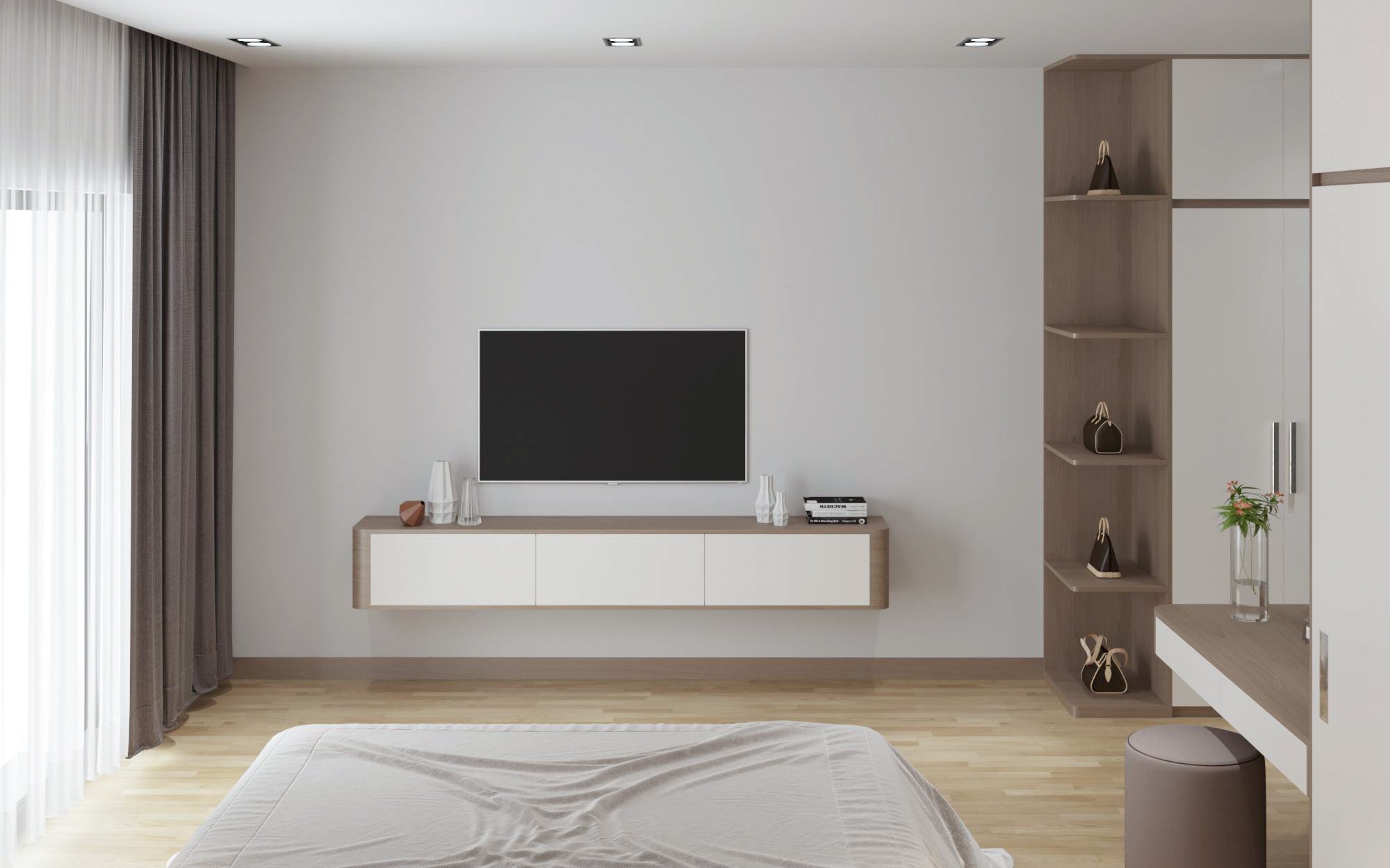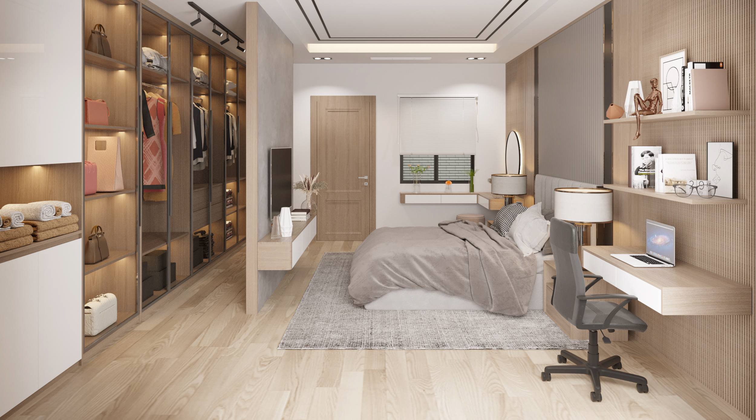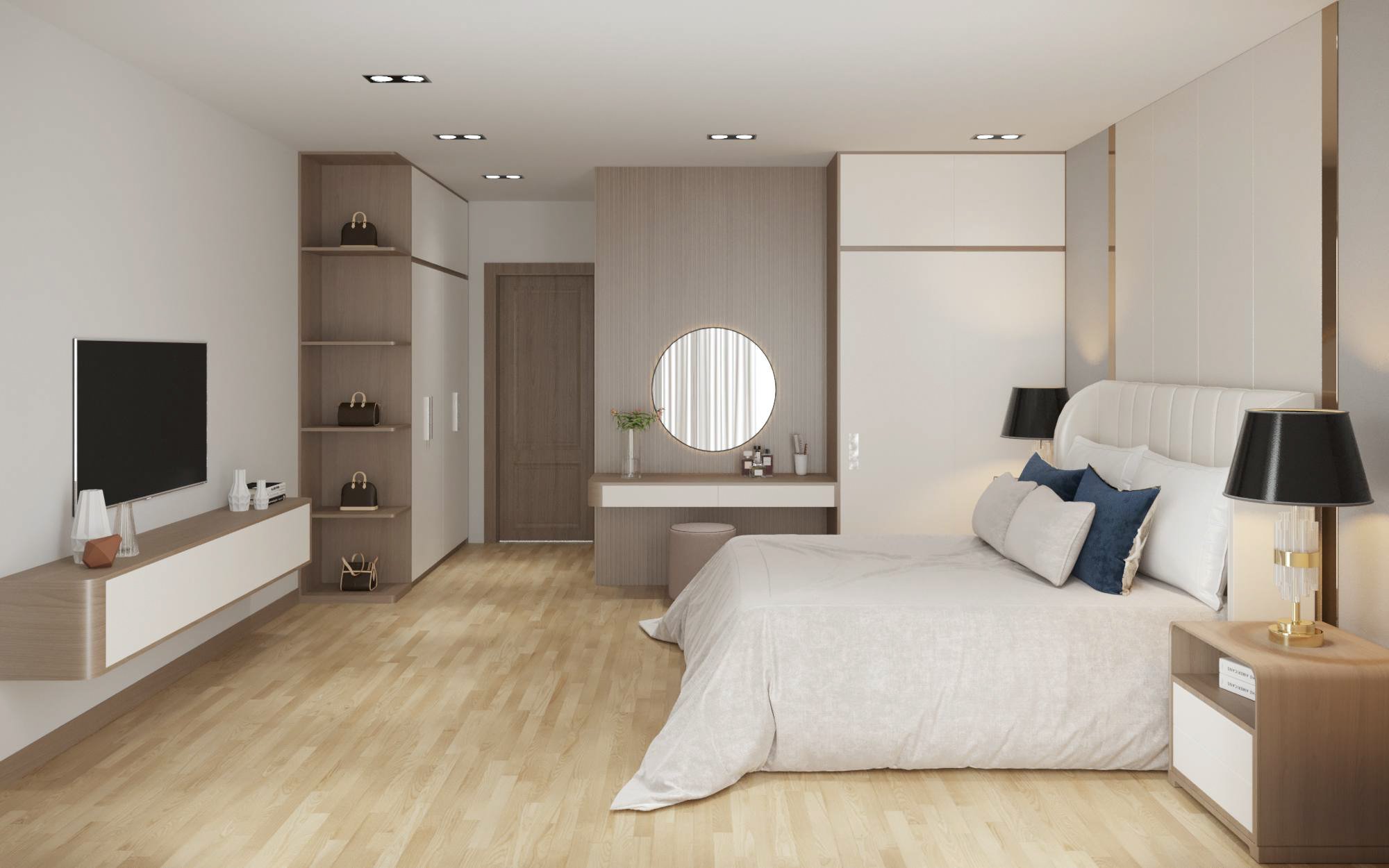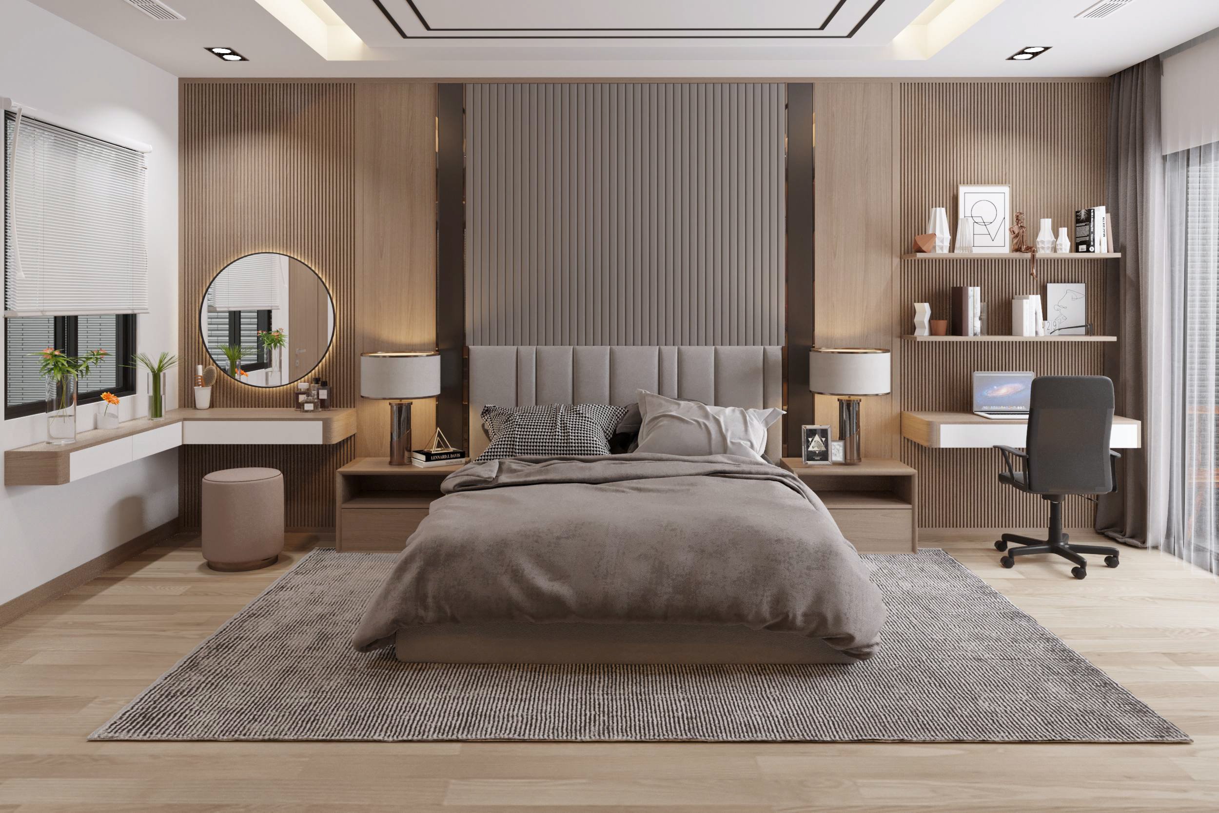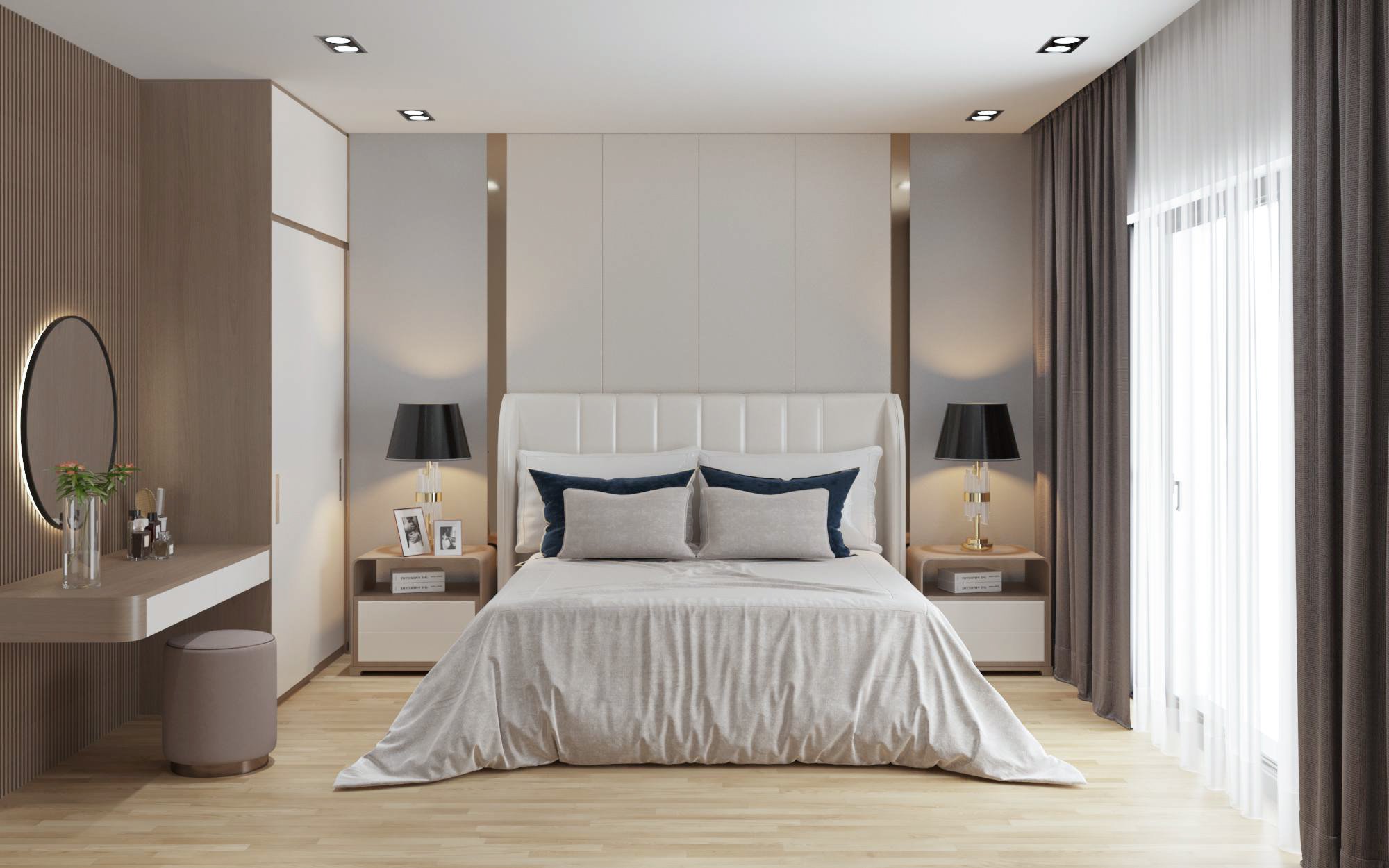 Phòng ngủ master gồm giường 2*2.2m bọc da xung quanh giường, hai bên giường là tab đèn, 1 bộ bàn phấn và bàn làm việc. Sau giường ốp gỗ phẳng và nan sóng