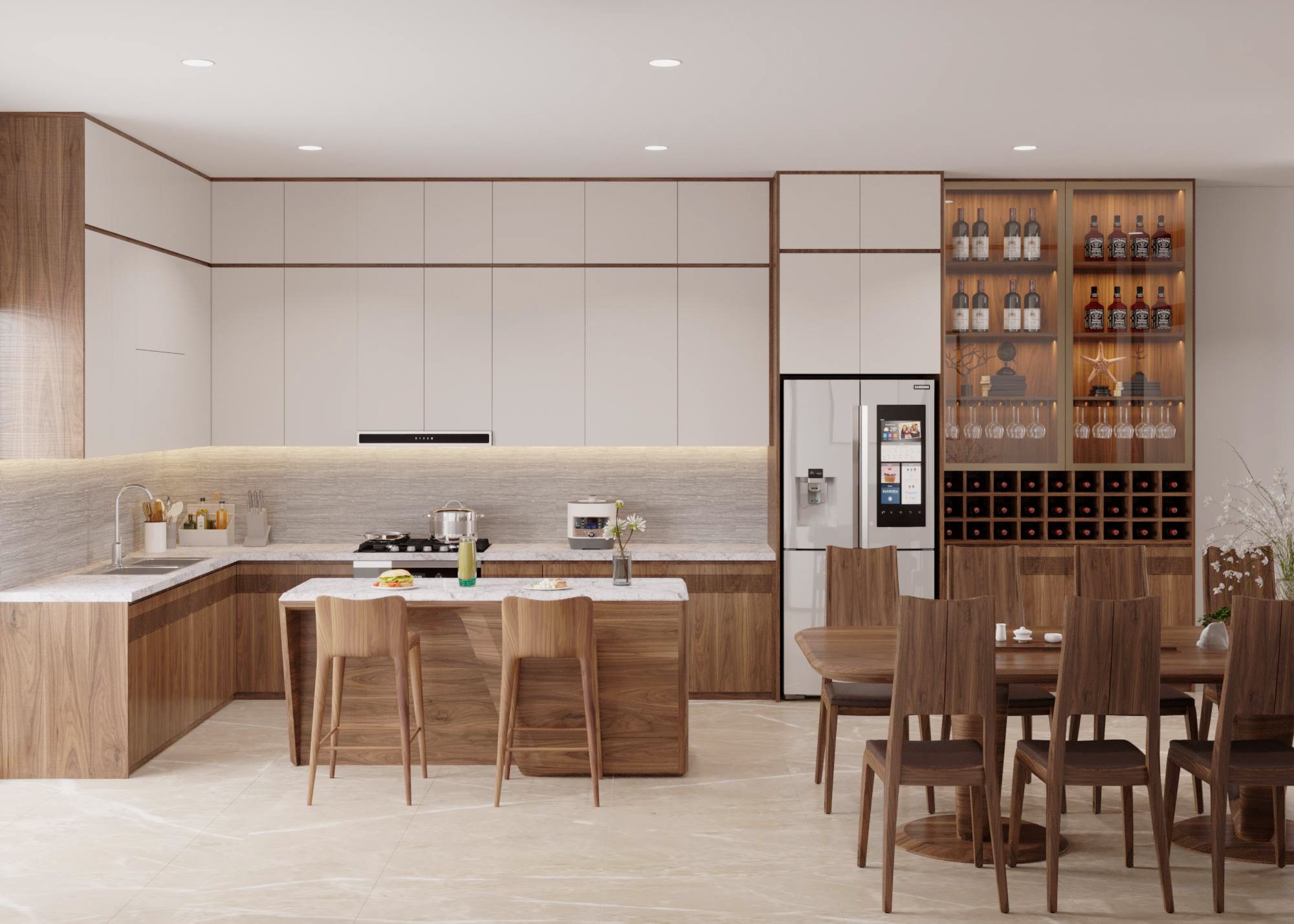 Phòng bếp: bộ tủ bếp chữ L kết hợp với tủ rượu trang trí làm bằng cốt plywood phủ venner cánh tủ rượu là cánh kính cường lực dày 5 ly cao cấp. Thêm bàn đảo tạo ra một không gian rộng rãi để gia chủ có thể thoải mỗi khi nấu nướng hoặc trang trí thức ăn