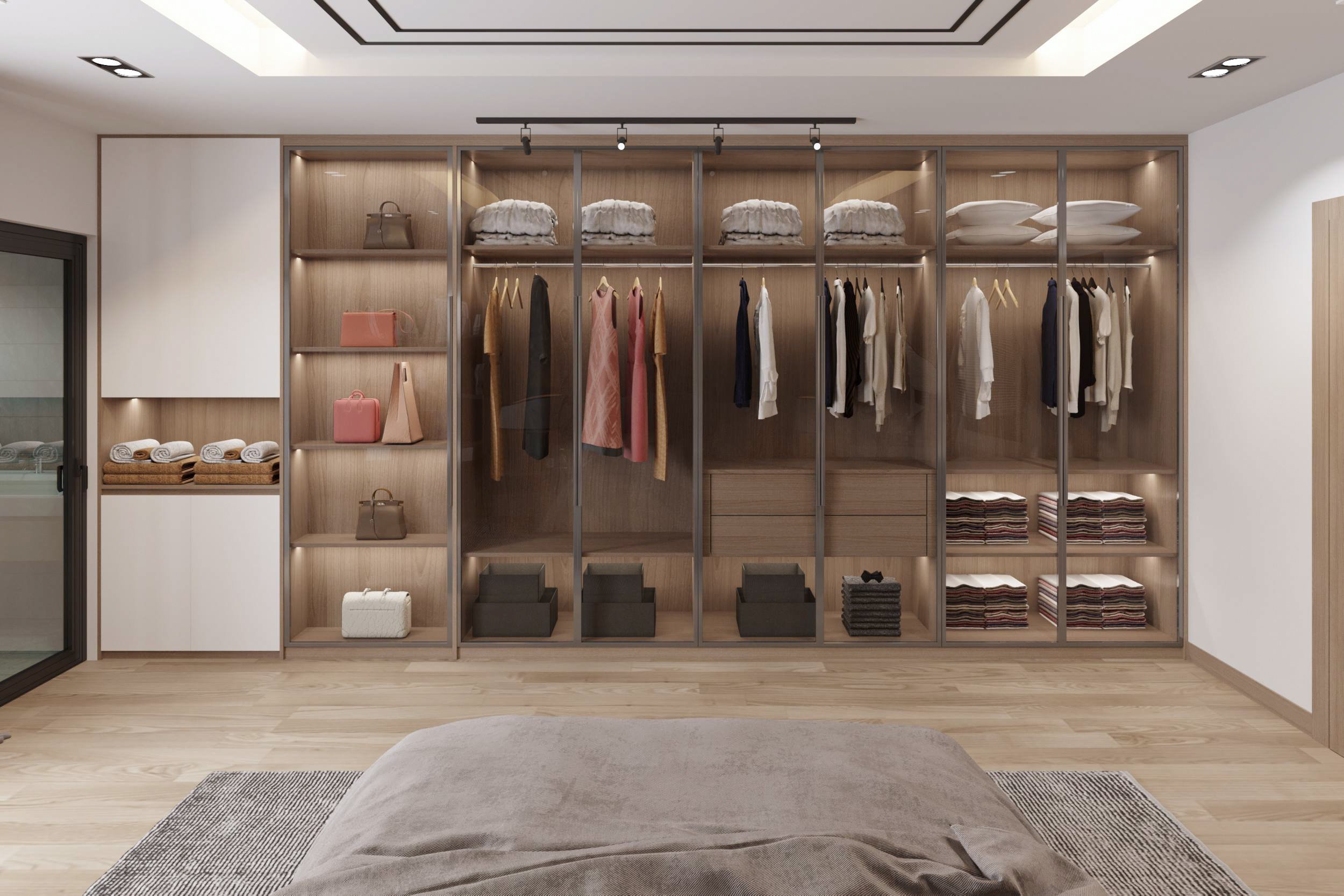 Tủ quần áo cánh kính cường lực dày 5ly, tủ áo rộng giúp phân chia đồ của 2 vợ chồng do đó dễ dàng tìm được món đồ mình muốn từ phía bên ngoài