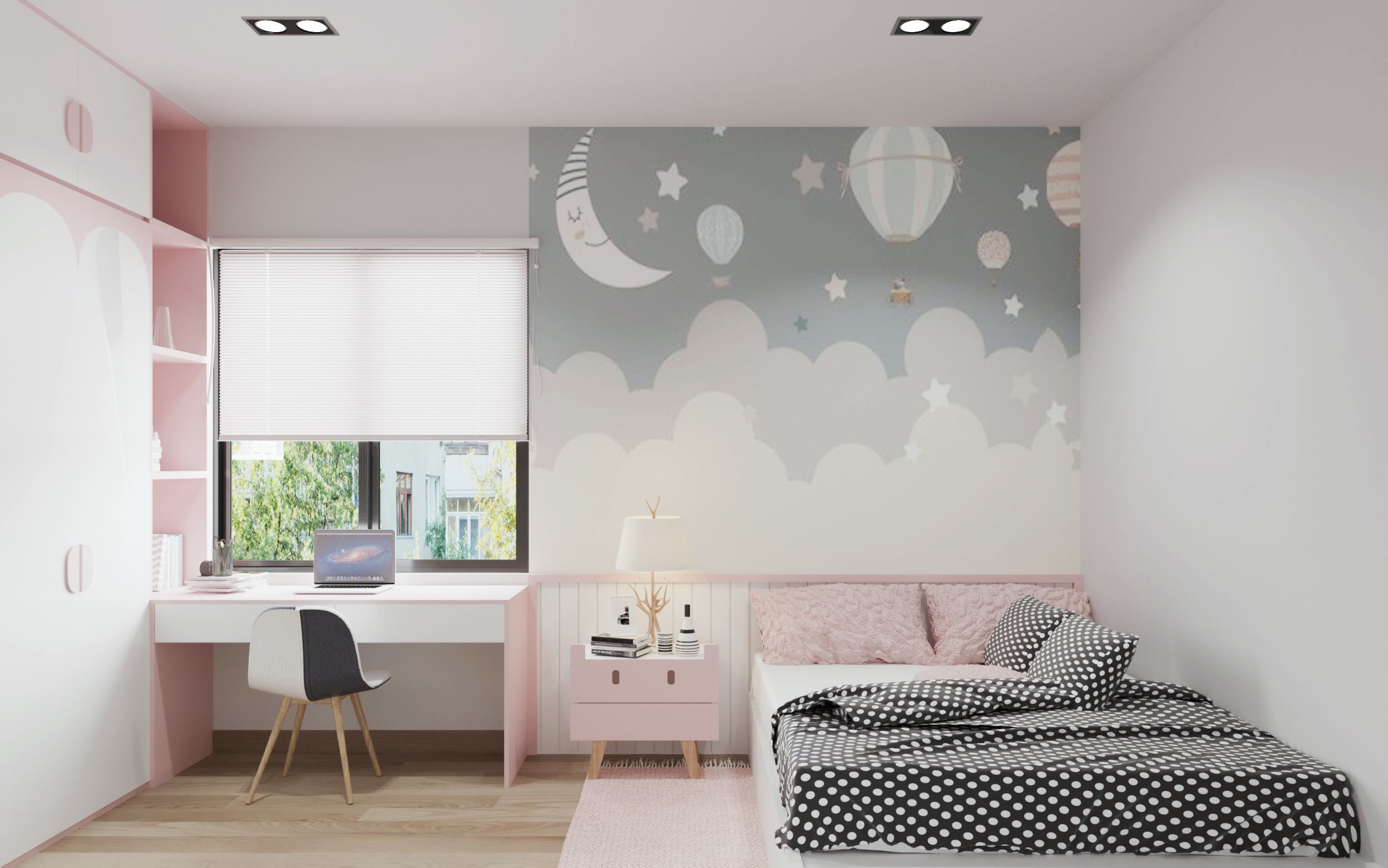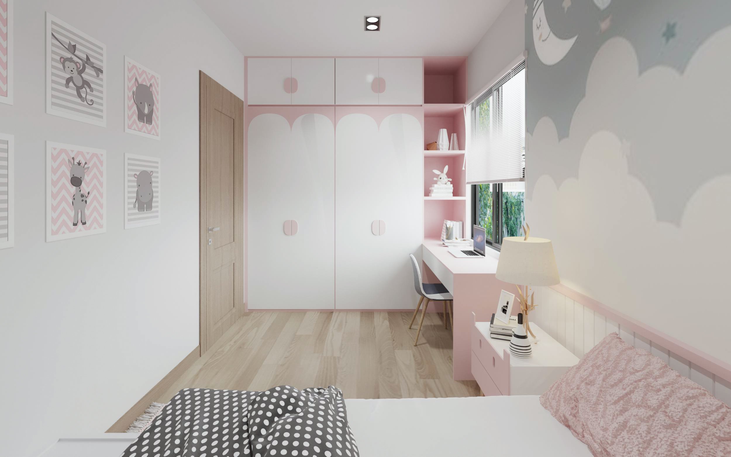 Phòng ngủ bé gái mang đến cho thiên thần nhỏ một không gian riêng tư. KTS Lê Gia đã sử dụng hài hòa 2 tông màu hồng phấn và màu trắng decor thêm giấy dán tường giúp kích thích sự thích thú của trẻ, biến không gian phòng ngủ của bé trở nên tràn ngập sắc màu và sinh động hơn. Đó là cách Lê Gia thể hiện tình yêu thương của bố mẹ giành cho cô công chúa nhỏ của họ.