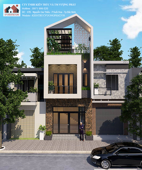 Mặt tiền màu sắc chủ đạo là các mảng Sáng màu kết hợp với các loại vật liệu trang trí, làm nổi các mảng khối kiến trúc .