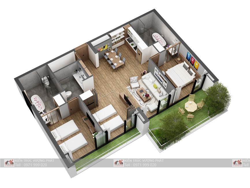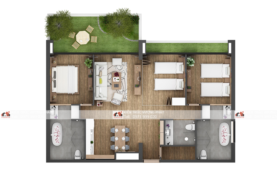 Phối cảnh nội thất tổng thể nhìn từ trên cao xuống :