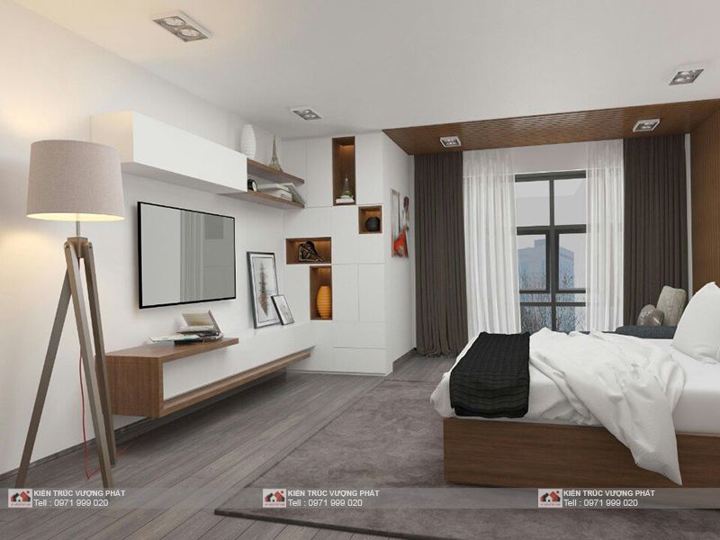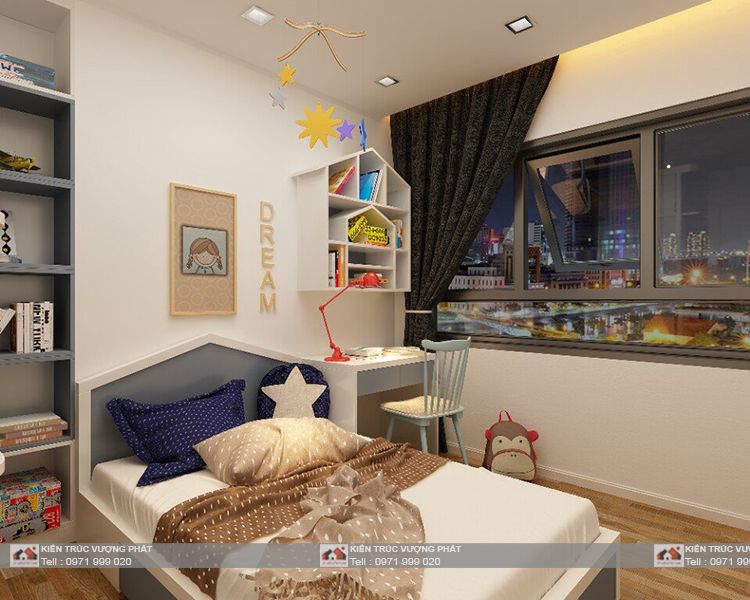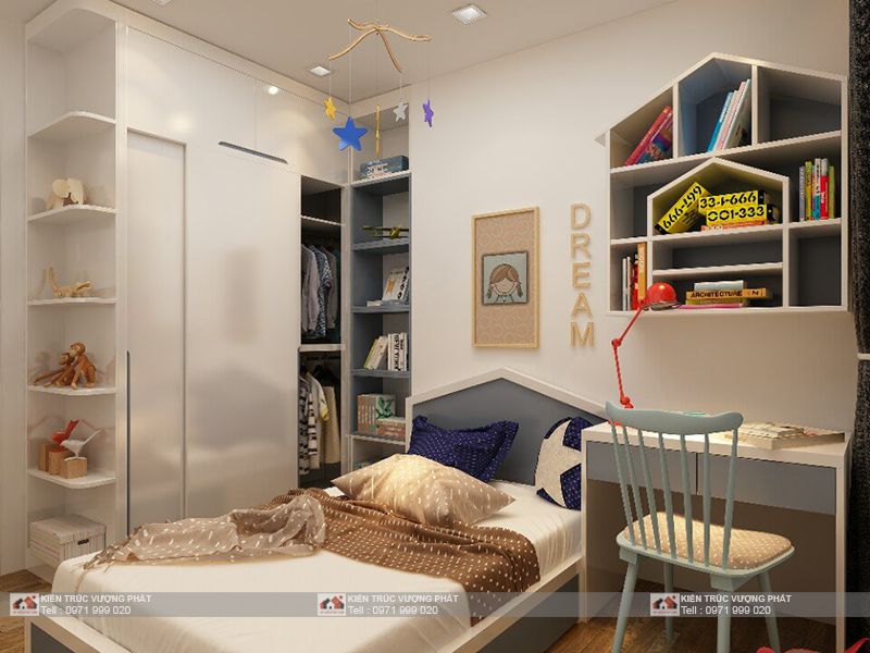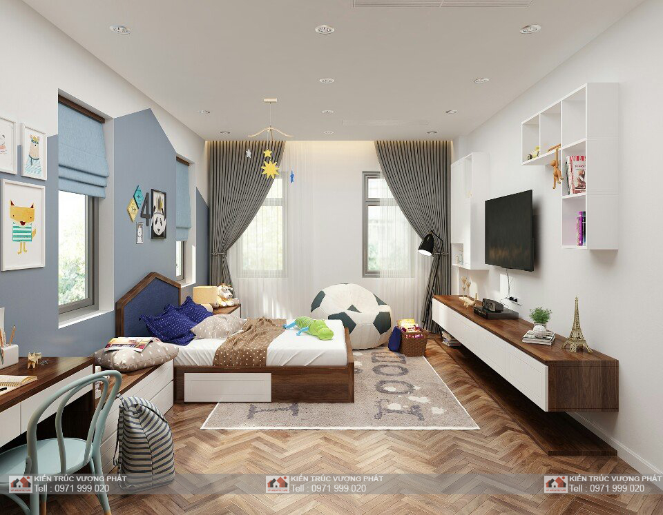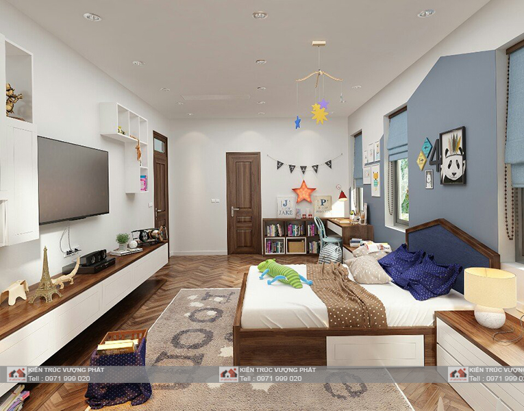 Phòng Ngủ con trai với đầu đủ đồ đạc và không gian nhưn phòng người lơn : bàn học + Tivi + Đồ deco trang trí với màu sắc nhẹ nhàng phù hợp với không gian trong nhà.