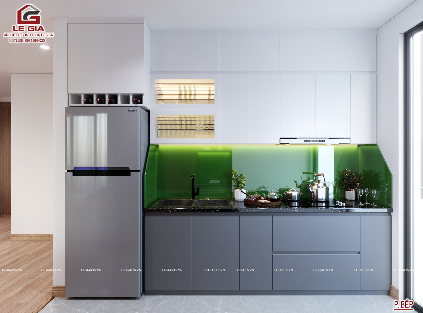 Khu vực bếp với thiết kế đầy đủ các công năng bao gồm giá bát nâng hạ cánh đẩy sử dụng tay nâng Blum HF22 của Áo, 2 giá xoong nồi inox 304, 01 giá dao thớt inox 304 đều nhập khẩu Eurogold. Bếp từ đôi, hút mùi cảm biến vẫy tay, chậu đúc 2 hố cân inox 304