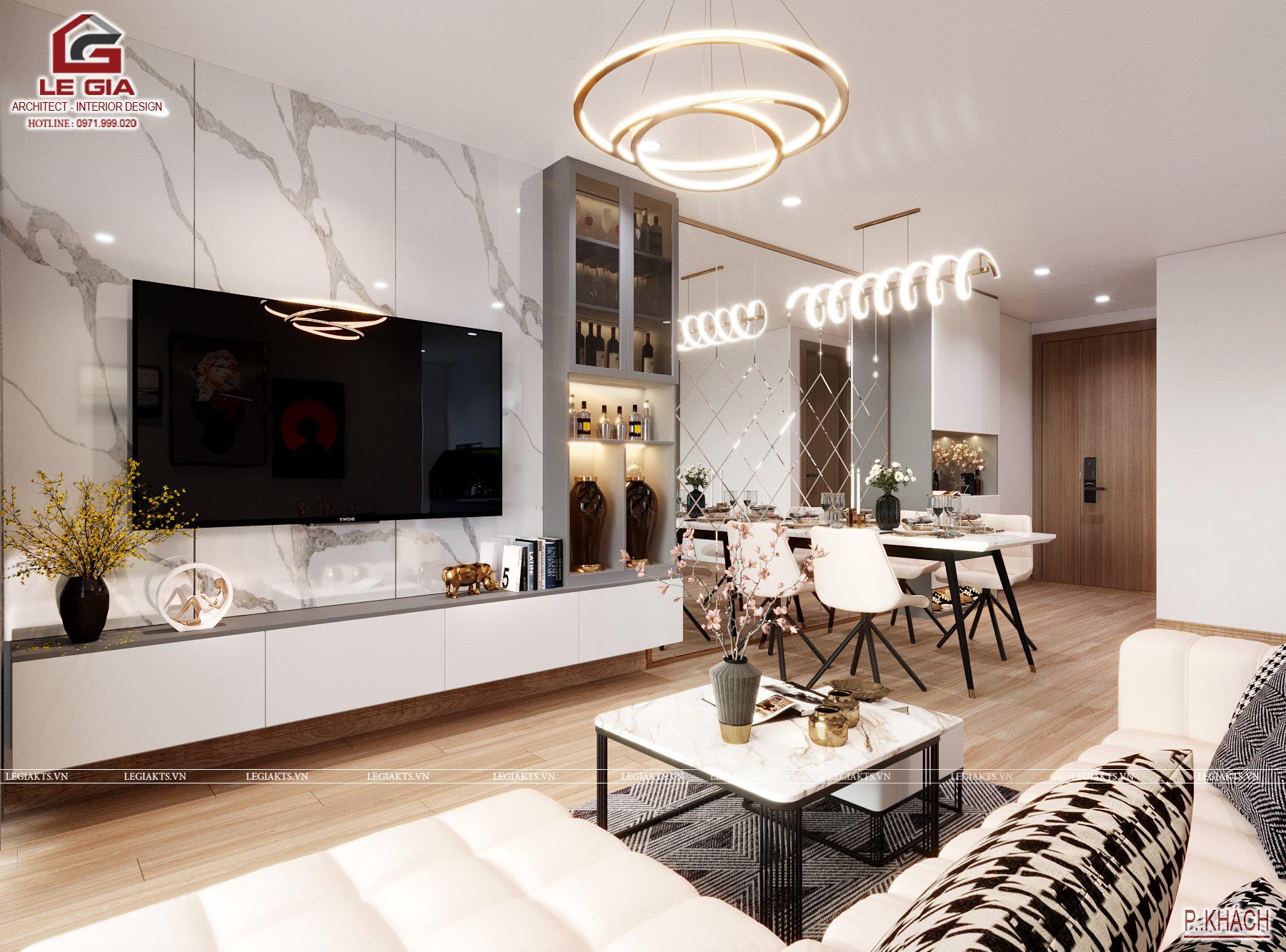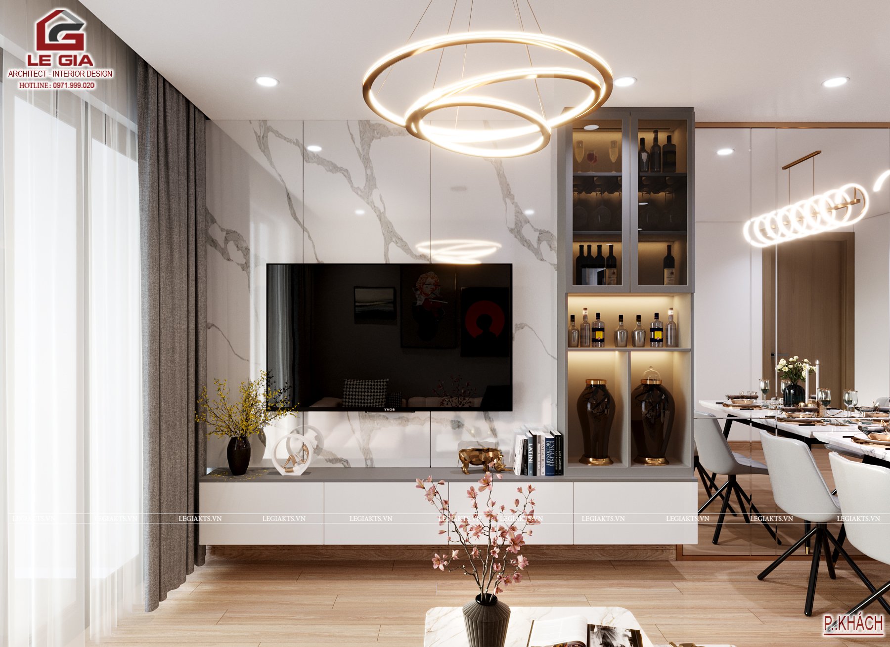 Kệ tivi treo phía sau là PVC giả đá trên nền cốt min, bên cạnh là tủ rượu cánh min có soi kính.