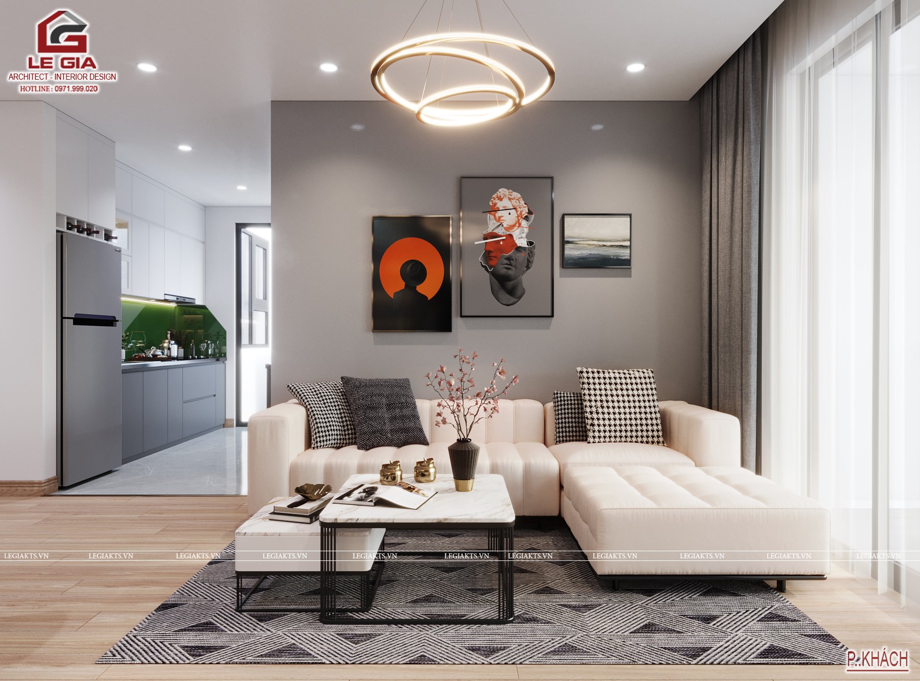 Sofa gồm 1 văng dài và 1 ngăn rời ngắn có thể di chuyển linh hoạt phù hợp với diện tích căn hộ, sắc màu tươi sáng tô điểm cho không gian thêm ấm cúng hơn. Bàn trà vuông lồng đôi tiết kiệm diện tích mặt đá trắng vân mây