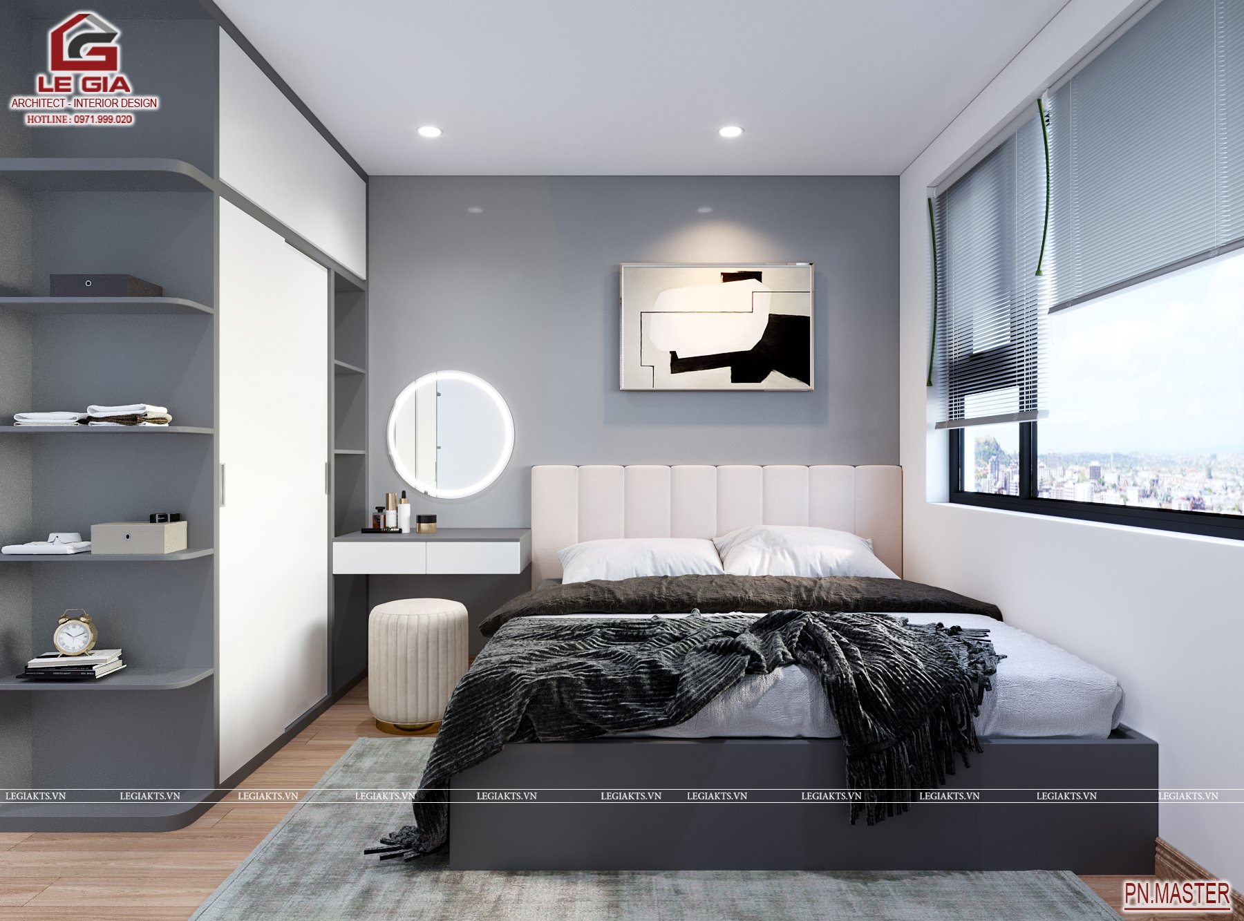 Phòng ngủ Master với màu ghi xanh là chủ đạo tạo cảm giác thời thượng.